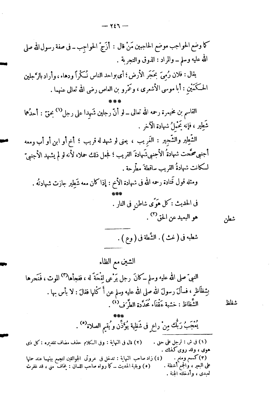 6 - كَمَا وضع الحواجب مَوضِع الحاجبين من قَالَ: أَزجّ الحواجب فِي صفة رَسُول الله صلى الله عَلَيْهِ وَسلم وَالْمرَاد: الذَّوْق والتجربة. يُقَال: فلَان رمى بِحجر الأَرْض أَي بِوَاحِد النَّاس نكراً ودهاء وَأَرَادَ بِالرجلَيْنِ الْحكمَيْنِ: أَبَا مُوسَى الْأَشْعَرِيّ وَعَمْرو بن الْعَاصِ رَضِي الله تَعَالَى عَنْهُمَا. الْقَاسِم بن مخيمرة رَحمَه الله تَعَالَى لَو أَن رجلَيْنِ شَهدا على رجل بحقّ: أَحدهمَا شطير فَإِنَّهُ يحمل شَهَادَة الآخر. الشطير والشجير: الْغَرِيب يَعْنِي لَو شهد لَهُ قريب أَخ أَو ابْن أَو أَب وَمَعَهُ أجنبى صححت شَهَادَة الأجنبى الْقَرِيب فَجعل ذَلِك حملا لِأَنَّهُ لَو لم يشْهد الْأَجْنَبِيّ لكَانَتْ شَهَادَة الْقَرِيب سَاقِطَة مطّرحة. وَمثله قَول قَتَادَة رَحمَه الله فِي شَهَادَة الْأَخ: إِذا كَانَ مَعَه شطير جَازَت شَهَادَته. فِي الحَدِيث: كل هوى شاطنٍ فِي النَّار.
