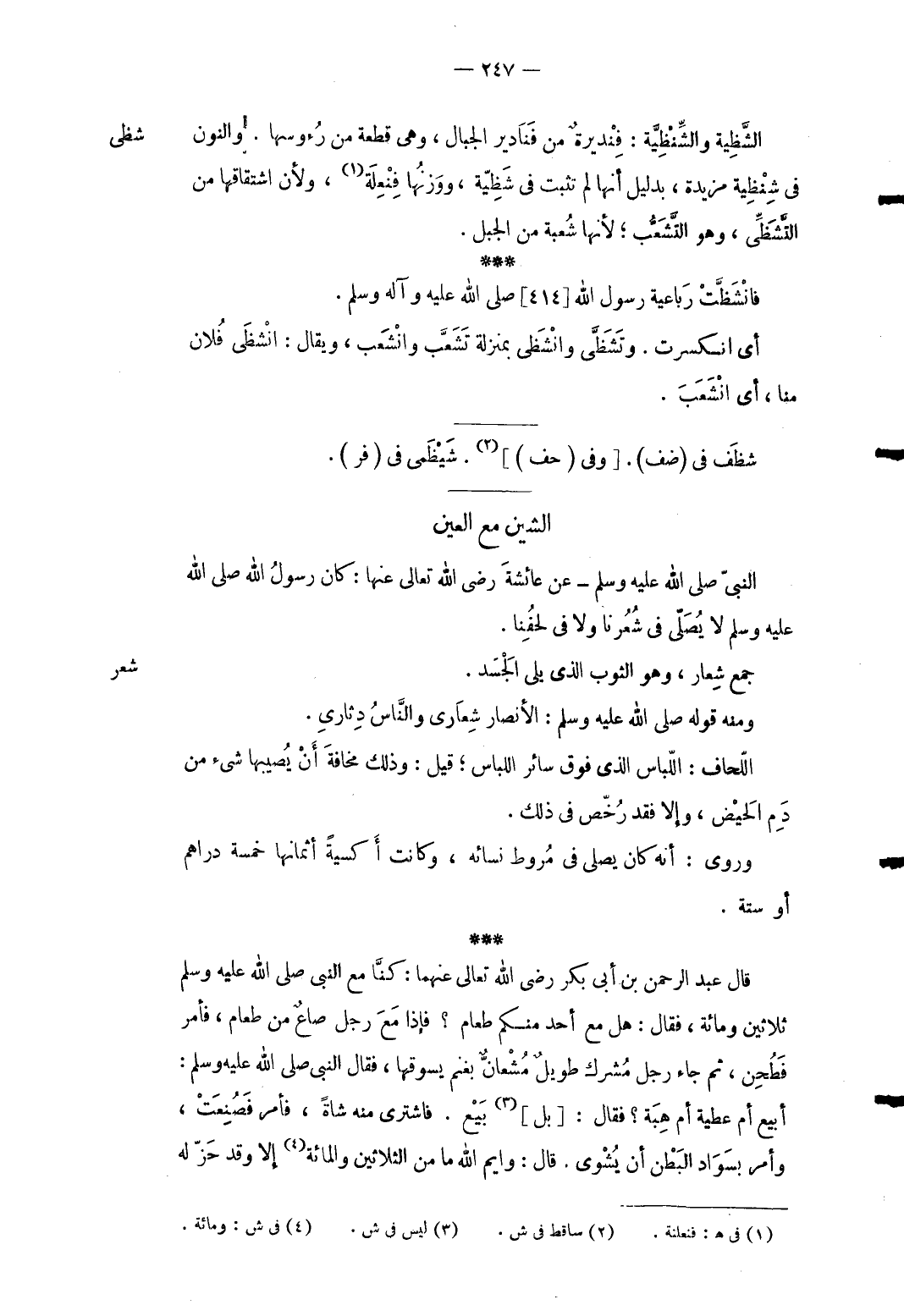 شعر جمع شعار وَهُوَ الثَّوْب الذى بلَى الْجَسَد. وَمِنْه قَوْله صلى الله عَلَيْهِ وَسلم: الْأَنْصَار شعاري وَالنَّاس دثاري. اللحاف: اللبَاس الَّذِي فَوق سَائِر اللبَاس قيل: وَذَلِكَ مَخَافَة أَن يُصِيبهَا شَيْء من دم الْحيض وَإِلَّا فقد رُخّص فِي ذَلِك. وروى: أَنه كَانَ يُصَلِّي فِي مروط نِسَائِهِ وَكَانَت أكسية أثمانها خَمْسَة دَرَاهِم أَو سِتَّة. قَالَ عبد الرَّحْمَن بن أبي بكر رَضِي الله تَعَالَى عَنْهُمَا: كُنَّا مَعَ النبى صلى الله عَلَيْهِ وَسلم ثَلَاثِينَ وَمِائَة فَقَالَ: هَل مَعَ أحد مِنْكُم طَعَام فَإِذا مَعَ رجل صَاع من طَعَام فَأمر فطحن ثمَّ جَاءَ رجل مُشْرك طَوِيل مشعان بِغنم يَسُوقهَا فَقَالَ النَّبِي صلى الله عَلَيْهِ وَسلم: أبيع أم عَطِيَّة أم هبة فَقَالَ: [بل] بيع فَاشْترى مِنْهُ شَاة فَأمر فصُنعت وَأمر بسواد الْبَطن أَن يشوى. قَالَ: وَايْم الله مَا من الثَّلَاثِينَ وَالْمِائَة إِلَّا وَقد حز لَهُ