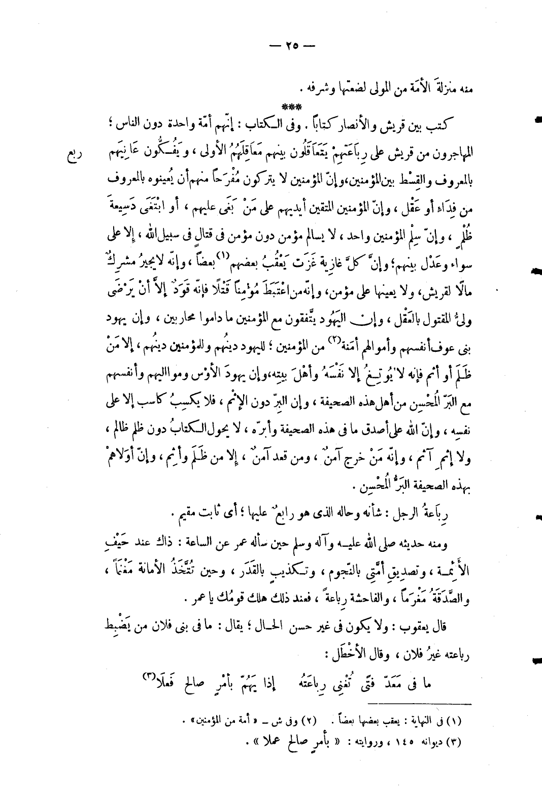 ربع بِالْمَعْرُوفِ والقسط بَين الْمُؤمنِينَ وَإِن الْمُؤمنِينَ لَا يتركون مفرحاً مِنْهُم أَن يعينوه بِالْمَعْرُوفِ من فدَاء أَو عقل وَإِن الْمُؤمنِينَ الْمُتَّقِينَ أَيْديهم على من بغى عَلَيْهِم أَو ابْتغى دسيعة ظلم وَإِن سلم الْمُؤمنِينَ وَاحِد لَا يسالم مُؤمن دون مُؤمن فى قتال فِي سَبِيل الله إِلَّا على سَوَاء وَعدل بَينهم وَإِن كل غَازِيَة غزت يعقب بَعضهم بَعْضًا وَإنَّهُ لَا يجير مُشْرك مَالا لقريش وَلَا يعينها على مُؤمن وَإنَّهُ من اعتبط مُؤمنا قتلا فَإِنَّهُ قَود إِلَّا أَن يرضى ولي الْمَقْتُول بِالْعقلِ وَإِن الْيَهُود يتفقون مَعَ الْمُؤمنِينَ مَا داموا محاربين وَإِن يهود بني عَوْف أنفسهم وَأَمْوَالهمْ أَمَنَة من الْمُؤمنِينَ للْيَهُود دينهم وَلِلْمُؤْمنِينَ دينهم إِلَّا من ظلم أَو أَثم فَإِنَّهُ لَا يوتغ إِلَّا نَفسه وَأهل بَيته وَإِن يهود الْأَوْس ومواليهم وأنفسهم مَعَ الْبر المحسن من أهل هَذِه الصَّحِيفَة وَإِن الْبر دون الْإِثْم فَلَا يكْسب كاسب إِلَّا على نَفسه وَإِن على أصدق مَا فِي هَذِه الصَّحِيفَة وأبره لَا يحول الْكتاب دون ظلم ظَالِم وَلَا إِثْم آثم وَإنَّهُ من خرج آمن وَمن قعد آمن إِلَّا من ظلم وأثم وَإِن أولاهم بِهَذِهِ الصَّحِيفَة الْبر المحسن. رباعة الرجل: شَأْنه وحاله الَّذِي هُوَ رَابِع عَلَيْهَا أَي ثَابت مُقيم. مِنْهُ حَدِيثه صلى الله عَلَيْهِ وَسلم حِين سَأَلَهُ عمر عَن السَّاعَة: ذَاك عِنْد حيف الْأَئِمَّة وتصديق أمتِي بالنجوم وَتَكْذيب بِالْقدرِ وَحين تتَّخذ الْأَمَانَة مغنماً وَالصَّدَََقَة مغرماً والفاحشة رباعة فَعِنْدَ ذَلِك هلك قَوْمك يَا عمر. قَالَ يَعْقُوب: وَلَا يكون فِي غير حسن الْحَال يُقَال: مَا فِي بني فلَان من يضْبط رباعته غير فلَان وَقَالَ الأخطل: ... مَا فِي مَعَدّ فَتى تُغْنِي رِباعَتُه ... إِذا يَهُمّ بأمْرٍ صَالح فعلا ...