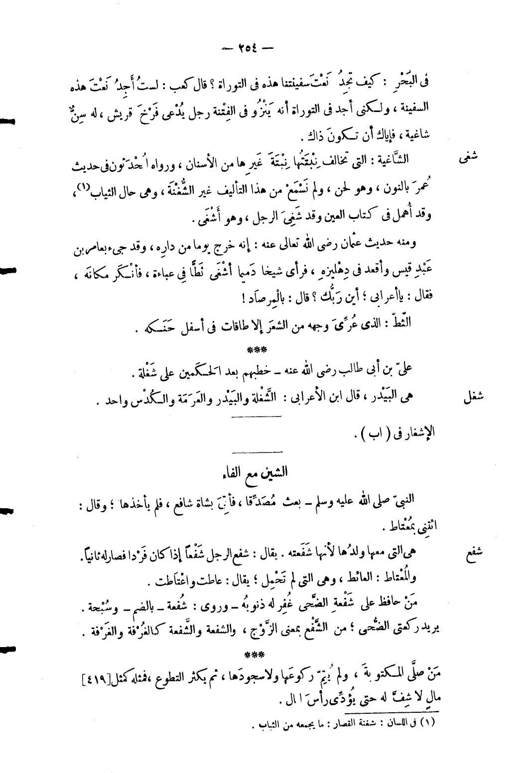 شفع هِيَ الَّتِي مَعهَا وَلَدهَا لِأَنَّهَا شفعته. يُقَال: شفع الرجل شفعاً إِذا كَانَ فَردا فَصَارَ لَهُ ثَانِيًا. والمعتاط: العائط وَهِي الَّتِي لم تحمل يُقَال: عاطت واعتاطت. من حَافظ على شُفْعَة الضُّحَى غُفر لَهُ ذنُوبه وروى: شُفْعَة بِالضَّمِّ وسبحة. يُرِيد رَكْعَتي الضُّحَى من الشفع بِمَعْنى الزَّوْج وَالشُّفْعَة والشَّفعة كالغُرْفة والغَرْفة. من صلى الْمَكْتُوبَة وَلم يتم ركوعها وَلَا سجودها ثمَّ يكثر التَّطَوُّع فَمثله كَمثل [419] مالٍ لَا شف لَهُ حَتَّى يُؤدى رَأس لمَال.