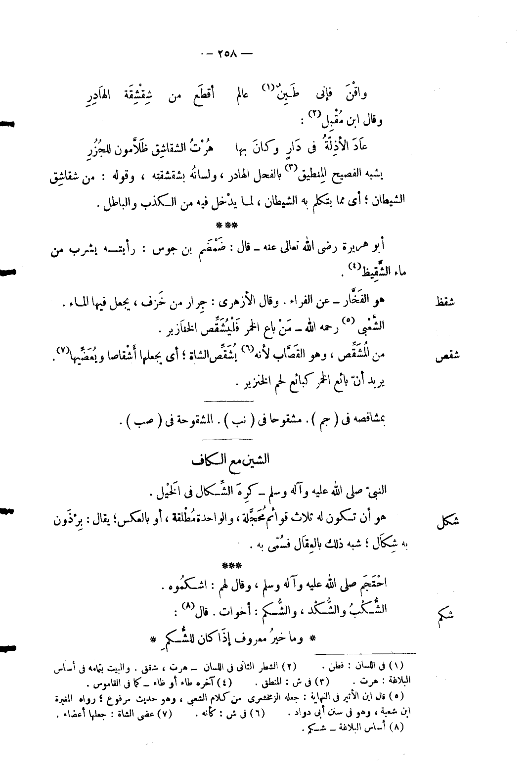 8 - واقْنَ فَإِنِّي طَبِنٌ عَالم أقطَع من شِقْشِقَة الهاذر ... وَقَالَ ابْن مقبل: ... عَادَ الأذِلّةُ فِي دَارٍ وكانَ بهَا ... هُرْتُ الشقاشِق ظَلاَّمون للجُزُرِ ... يشبه الفصيح المنطيق بالفحل الهادر وَلسَانه بشقشقته وَقَوله: من شقاشق الشَّيْطَان أَي مِمَّا يتَكَلَّم بِهِ الشَّيْطَان لما يدْخل فِيهِ من الْكَذِب وَالْبَاطِل. أَبُو هُرَيْرَة رَضِي الله تَعَالَى عَنهُ قَالَ: ضَمْضَم بن جوس: رَأَيْته يشرب من مَاء الشقيظ.