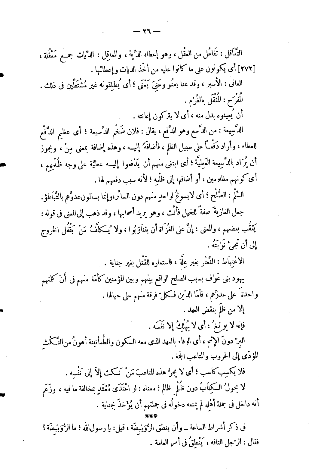 6 - التعاقل: تفَاعل من الْعقل وَهُوَ إِعْطَاء الدِّيَة والمعاقل: الدِّيات جمع معقلة [272] أَي يكونُونَ على مَا كَانُوا عَلَيْهِ من أَخذ الدِّيات وإعطائها. العاني: الْأَسير وَقد عَنَّا يعنو وعنى يَعْنِي أَي يطلقونه غير مشتطين فِي ذَلِك. المفرح: المثقل بالغرم. أَن يعينوه بدل مِنْهُ أَي لَا يتركون إعانته. الدسيعة: من الدسع وَهُوَ الدّفع يُقَال: فلَان ضخم الدسيعة أَي عَظِيم الدّفع للعطاء وَأَرَادَ دفعا على سَبِيل الظُّلم فأضافه إِلَيْهِ وَهَذِه لإضافة بِمَعْنى من وَيجوز أَن يُرَاد بالدسيعة الْعَطِيَّة أَي ابْتغى مِنْهُم أَن يدفعوا إِلَيْهِ عَطِيَّة على وَجه ظلمهم أَي كَونهم مظلومين أَو أضافها إِلَى ظلمه لِأَنَّهُ سَبَب دفهم لَهَا. السّلم: الصُّلْح أَي لَا يسوغ لوَاحِد مِنْهُم دون السائر وَإِنَّمَا يسالمون عدوهم بالتباطؤ. جعل الغازية صفة للخيل فأنث وَهُوَ يُرِيد أَصْحَابهَا وَقد ذهب إِلَى الْمَعْنى فِي قَوْله: يعقب بَعضهم وَالْمعْنَى: إِن على الْغُزَاة أَن يتناوبوا وَلَا يُكلف من يقفل الْخُرُوج إِلَى أَن تَجِيء نوبَته. الاعتباط: النَّحْر بِغَيْر عِلّة فاستعاره للْقَتْل بِغَيْر جِنَايَة. يهود بني عَوْف بِسَبَب الصُّلْح الْوَاقِع بَينهم وَبَين الْمُؤمنِينَ كأمة مِنْهُم فِي أَن كلمتهم وَاحِدَة على عدوهم فَأَما الدّين فَكل فرقة مِنْهُم على حيالها. إِلَّا من ظلم بِنَقْض الْعَهْد. فَإِنَّهُ لَا يوتغ: أَي لَا يهْلك إِلَّا نَفسه. الْبر دون الْإِثْم أَي الْوَفَاء بالعهد الَّذِي مَعَه السّكُون والطمأنينة أَهْون من النكث الْمُؤَدِّي إِلَى الحروب والمتاعب الجمة. فَلَا يكْسب كاسب أَي لَا يجر هَذِه المتاعب من نكث إِلَّا إِلَى نَفسه. لَا يحول الْكتاب دون ظلم ظَالِم مَعْنَاهُ: لَو اعْتدى مُعْتَد بمخالفة مَا فِيهِ وَزعم أَنه دَاخل فِي جملَة أَهله لم يمنعهُ دُخُوله فِي جُمْلَتهمْ أَن يُؤْخَذ بِجِنَايَة. فِي ذكر أَشْرَاط السَّاعَة وَأَن ينْطق الرويبضة قيل: يَا رَسُول الله مَا الرويبضة فَقَالَ: الرجل التافه ينْطق فِي أَمر الْعَامَّة.