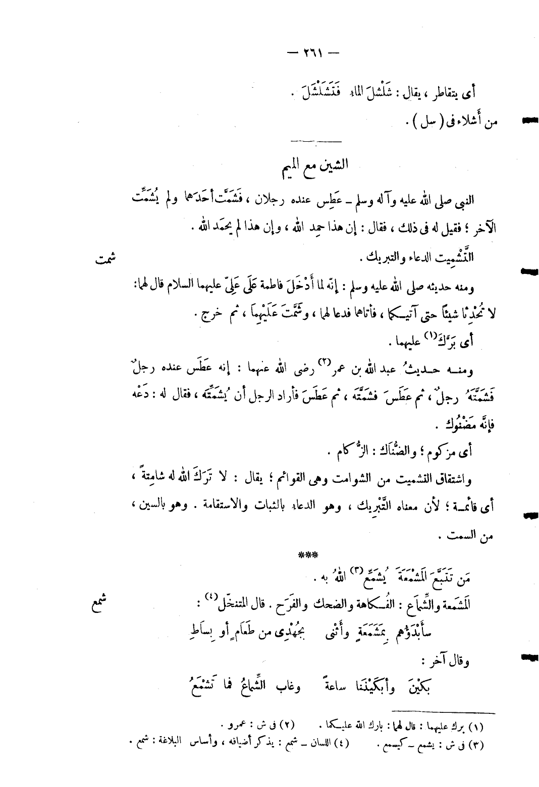 شمت التشميت الدُّعَاء والتبريك. وَمِنْه حَدِيثه صلى الله عَلَيْهِ وَسلم: إِنَّه لما أَدخل فَاطِمَة على عَليّ عَلَيْهِمَا السَّلَام قَالَ لَهما: لَا تحدثا شَيْئا حَتَّى آتيكما فأتاهما فَدَعَا لَهما وشمَّت عَلَيْهِمَا ثمَّ خرج. أَي برَّك عَلَيْهِمَا. وَمِنْه حَدِيث عبد الله بن عمر رَضِي الله عَنْهُمَا: إِنَّه عطس عِنْده رجل فشمته رجل ثمَّ عطس فشمَّته ثمَّ عطس فَأَرَادَ الرجل أَن يشمته فَقَالَ لَهُ: دَعه فَإِنَّهُ مضنوك أَي مزكوم والضناك: الزُّكَام. واشتقاق التشميت من الشوامت وَهِي القوائم يُقَال: لَا ترك الله لَهُ شامتةً أَي قَائِمَة لِأَن مَعْنَاهُ التبريك وَهُوَ الدُّعَاء بالثبات والاستقامة وَهُوَ بِالسِّين من السمت. من تتبع المشمعة يشمِّع الله بِهِ.