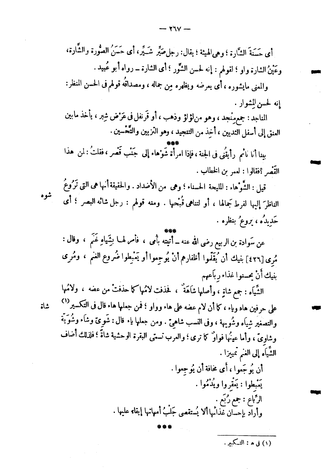 شَاة والتصغير شِيَاه وشويهة وَفِي النّسَب شاهي. وَمن جعلهَا يَاء قَالَ: شوى وتشاء وشوية وشاويّ وَأما عينهَا فواو كَمَا ترى وَالْعرب تسمي الْبَقَرَة الوحشية شَاة فَلذَلِك أضَاف الشياه إِلَى الْغنم تمييزا. أَن يوجعوا أَي مَخَافَة أَن يوجعوا. يعبطوا: يعقروا ويدموا. الرِّباع: جمع ربع. وَأَرَادَ بِإِحْسَان غذائها أَلا يستقصي جلب أمهاتها إبْقَاء عَلَيْهَا.