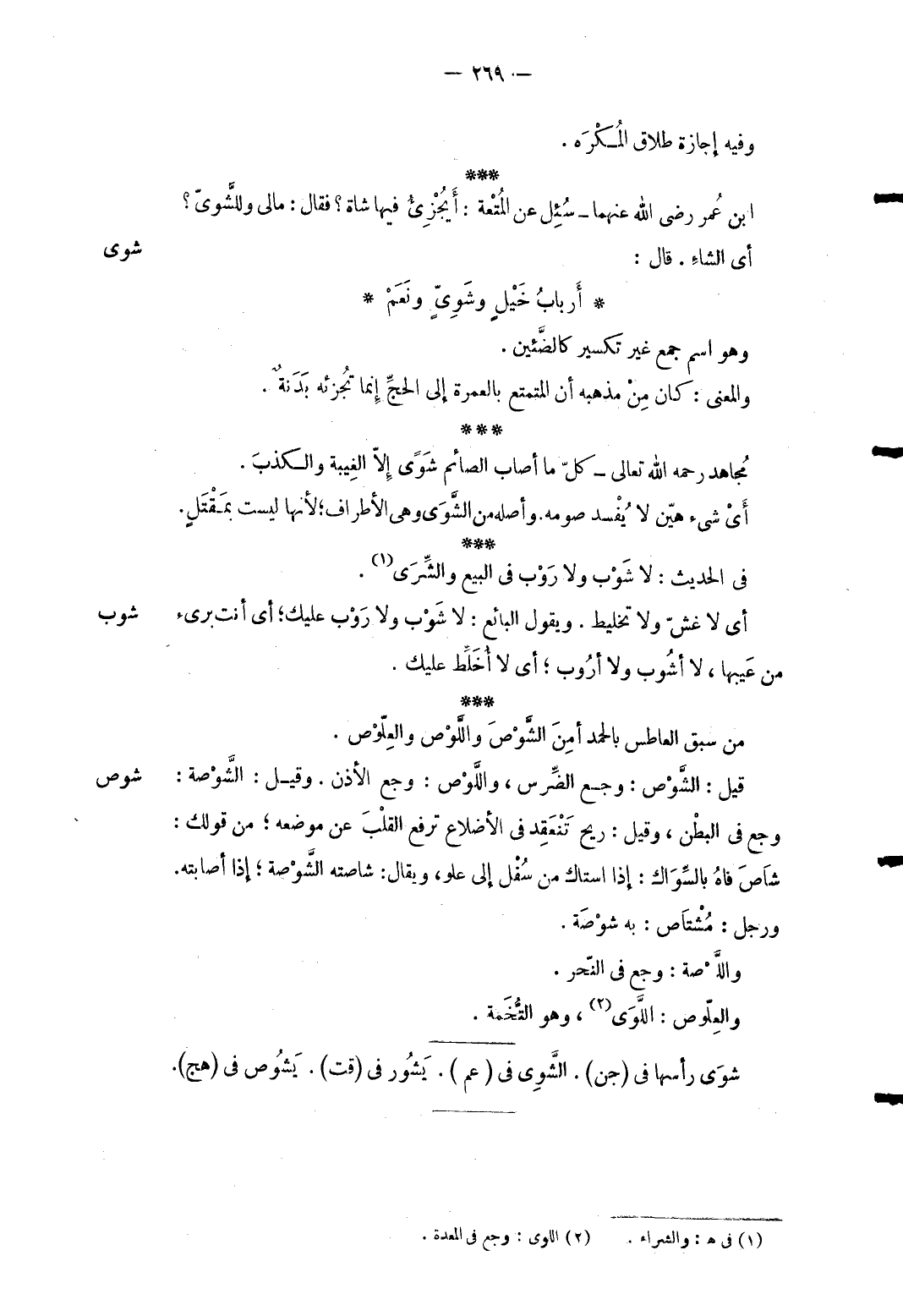 شوى أَي الشَّاء. قَالَ: ... أَربابُ خَيْلٍ وشَوِيٍّ ونَعَمْ ... وَهُوَ اسْم جمع غير تكسير كالضئين. وَالْمعْنَى: كَانَ من مذْهبه أَن الْمُتَمَتّع بِالْعُمْرَةِ إِلَى الْحَج إِنَّمَا تُجزئه بَدَنَة. مُجَاهِد رَحمَه الله تَعَالَى كل مَا أصَاب شوى إِلَّا الْغَيْبَة وَالْكذب. أَي شَيْء هيّن لَا يفْسد صَوْمه. وَأَصله من الشوى وَهِي الْأَطْرَاف لِأَنَّهَا لَيست بمقتل. فِي الحَدِيث: لَا شوب وَلَا روب فى البيع والشرى.