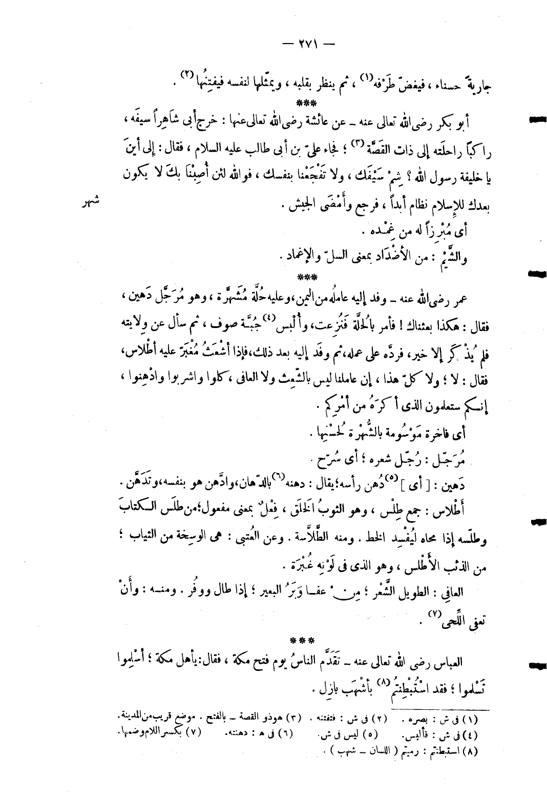 شهر أَي مبرزاً لَهُ من غمده. والشيم: من الأضداد بِمَعْنى السلّ والإغماد. عمر رَضِي الله عَنهُ وَفد إِلَيْهِ عَامله من واليمن وَعَلِيهِ حلَّة مشهرة وَهُوَ مرجل دَهِين فَقَالَ: هَكَذَا بعثناك فَأمر بالحلة فنُزعت وأُلبس جُبَّة صوف ثمَّ سَأَلَ عَن ولَايَته فَلم يذكر إِلَّا خير فَرده على عمله ثمَّ وَفد إِلَيْهِ بعد ذَلِك فَإِذا أَشْعَث مغبر عَلَيْهِ أطلاس فَقَالَ: لَا وَلَا كل هَذَا إِن عاملنا لَيْسَ بالشعث وَلَا الْعَافِي كلوا وَاشْرَبُوا وادهنوا إِنَّكُم ستعلمون الَّذِي أكره من أَمركُم. أى فاخرة موسومة بالشهرة لحسنها. مرجل: رُجّل شعره أَي سُرّح. دَهِين: [أَي] دهن رَأسه يُقَال دهنه بالدهان وادَّهن هُوَ بِنَفسِهِ وتدهَّن. أطلاس: جمع طلس وَهُوَ الثَّوْب الْخلق فعل بِمَعْنى مفعول من طلس الْكتاب وطلّسه إِ ذَا محاه ليفسد الْخط. وَمِنْه الطَّلاَّسة. وَعَن الْعُتْبِي: هِيَ الوسخة من الثِّيَاب من الذِّئْب الأطلس وَهُوَ الَّذِي فِي لَونه غبرة. الْعَافِي: الطَّوِيل الشّعْر من عَفا وبر الْبَعِير إِذا طَال ووفر. وَمِنْه: وَأَن تعفى اللحى (7) . الْعَبَّاس رَضِي الله تَعَالَى عَنهُ تقدَّم النَّاس يَوْم فتح مَكَّة فَقَالَ يأهل مَكَّة أَسْلمُوا تسلموا فقد استبطنتم بأشهب بازل.