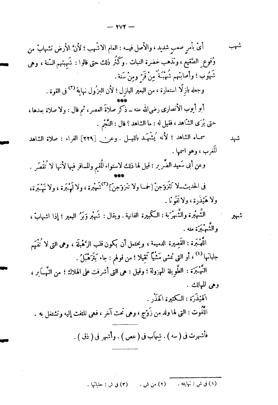 2 - شهب أَي بِأَمْر صَعب شَدِيد وَالْأَصْل فِيهِ: الْعَام الاشهب لِأَن الأَرْض تشهاب من وُقُوع الصقيع وَتذهب خضرَة النَّبَات وَكثر ذَلِك حَتَّى قَالُوا: شهبتهم السّنة وَهِي شهوب وأصابتهم شُهْبَة من قرّ وَمن سنة. وَجعله بازلاً اسْتِعَارَة من الْبَعِير البازل لِأَن البزول نِهَايَة فِي الْقُوَّة أَبُو أَيُّوب الْأنْصَارِيّ رَضِي الله عَنهُ ذكر صَلَاة الْعَصْر ثمَّ قَالَ: وَلَا صَلَاة بعْدهَا حَتَّى يُرى الشَّاهِد فَقيل لَهُ: مَا الشَّاهِد قَالَ النَّجْم.