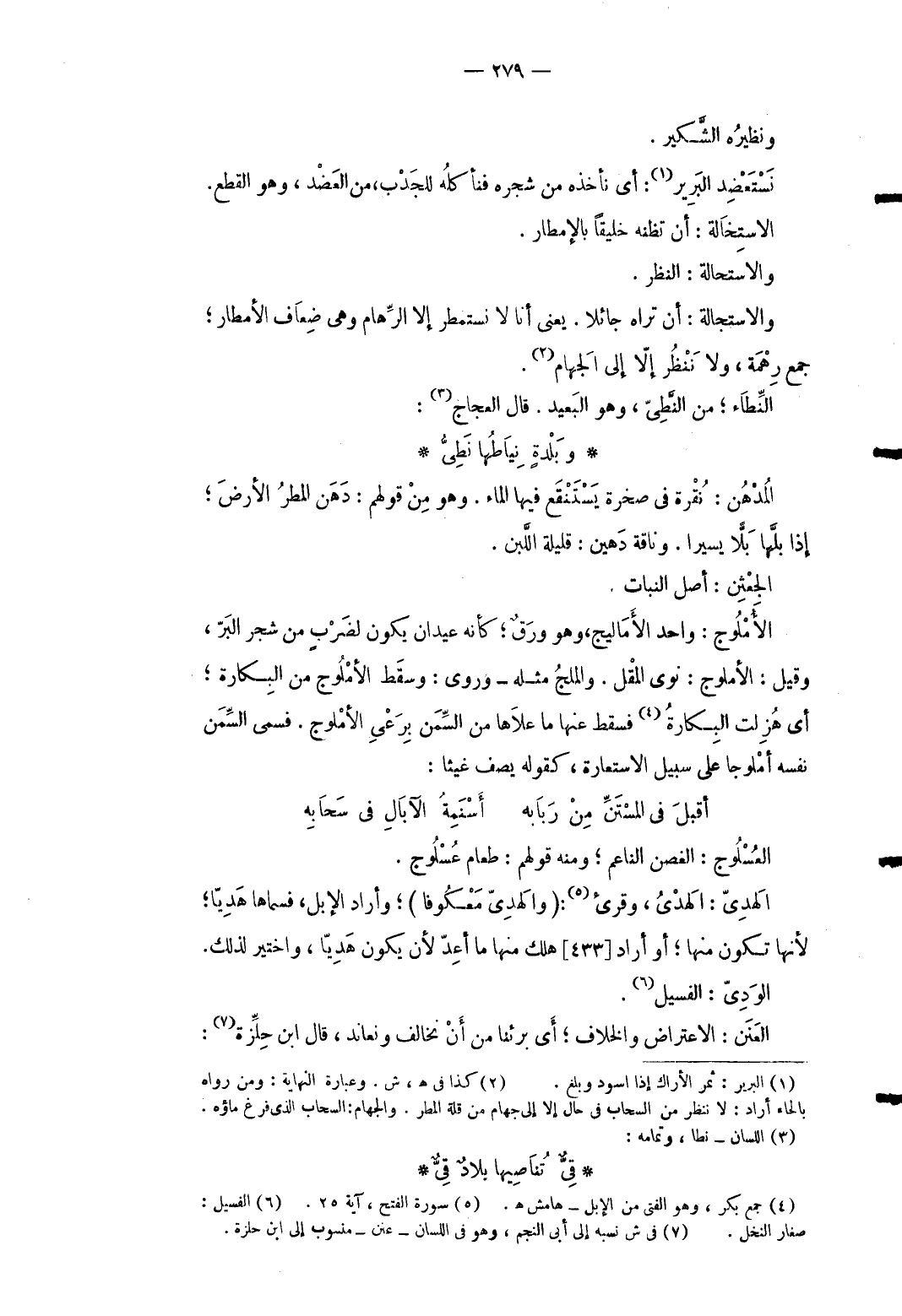 9 - وَنَظِيره الشكير. نستعضد البرير: أَي نَأْخُذهُ من شَجَره فنأكله للجدب من الْعَضُد وَهُوَ الْقطع. الاستخالة: أَن تظنه خليقا بالإمطار. والاستحالة: النّظر. والاستجالة: أَن ترَاهُ جائلا. يَعْنِي أَنا لَا نستمطر إِلَّا الرهام وَهِي ضِعَاف الأمطار جمع رهمة وَلَا نَنْظُر إِلَّا إِلَى الجهام. النطاء من النطي وَهُوَ الْبعيد. قَالَ العجاج: ... وبَلْدةٍ نِيَاطُها نَطِيُّ ... المدهن: نقرة فى صَخْرَة يستنفع فِيهَا المَاء. وَهُوَ من قَوْلهم: دهن الْمَطَر الأَرْض إِذا بلَّها بِلَا يَسِيرا. وناقة دَهِين: قَليلَة اللَّبن. الجعثن: أصل النَّبَات. الأملوج: وَاحِد الأماليج وَهُوَ ورق كَأَنَّهُ عيدَان يكون لضرب من شجر الْبر وَقيل: الأملوج: نوى الْمقل. والملج مثله وروى: وَسقط الأملوج من الْبكارَة أَي هزلت الْبكارَة فَسقط عَنْهَا مَا علاها من السّمن برعي الأملوج. فَسمى السّمن نَفسه أملوجا على سَبِيل الِاسْتِعَارَة كَقَوْلِه يصف غيثا: ... أقبلَ فِي المسْتَنِّ مِنْ رَبَابه ... أَسْنَمِةُ الآبَالِ فِي سَحَابِه ... العسلوج: الْغُصْن الناعم وَمِنْه قَوْلهم: طَعَام عسلوج. الْهدى: الْهدى وقرى: (وَالْهدى معكوفا) وَأَرَادَ الْإِبِل فسماها هَديا لِأَنَّهَا تكون مِنْهَا أَو أَرَادَ [433] هلك مِنْهَا مَا أعد لِأَن يكون هديّا واختير لذَلِك. الودى: الفسيل. العنن: الِاعْتِرَاض وَالْخلاف أَي بَرِئْنَا من أَن نخالف ونعاند قَالَ ابْن حلزة (7) :