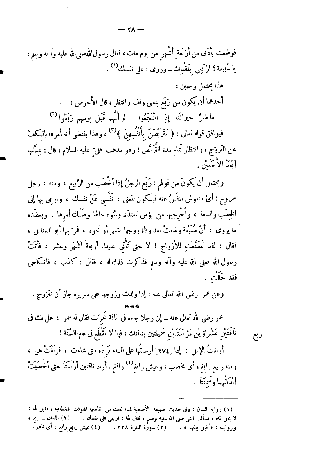 8 - فَوضعت بِأَدْنَى من أَرْبَعَة أشهر من يَوْم مَاتَ فَقَالَ رَسُول الله صلى الله عَلَيْهِ وَسلم: يَا سبيعة اربعي بِنَفْسِك وروى: على نَفسك. هَذَا يحْتَمل وَجْهَيْن: أَحدهمَا أَن يكون من ربع بِمَعْنى وقف وانتظر قَالَ الْأَحْوَص: ... مَا ضرّ جيراننا إِذْ انتجعوا ... لَو أَنهم قبل يومهم ربعوا ... فيوافق قَوْله تَعَالَى: {يَتَرَبَّصْنَ بِأَنْفُسِهِنّ} وَهَذَا يَقْتَضِي أَنه أمرهَا بالكفِّ عَن التَّزَوُّج وانتظار تَمام مُدَّة التَّرَبُّص وَهُوَ مَذْهَب عَليّ عَلَيْهِ السَّلَام قَالَ: عدتهَا أبعد الْأَجَليْنِ. وَيحْتَمل أَن يكون من قَوْلهم: ربع الرجل إِذا أخصب من الرّبيع وَمِنْه: رجل مربوغ أَي منعوش منفسٌ عَنهُ فَيكون الْمَعْنى: نَفسِي عَن نَفسك وارمي بهَا إِلَى الخصب وَالسعَة وأخرجيها عَن بؤس الْمُعْتَدَّة وَسُوء حَالهَا وضنك أمرهَا. ويعضده مَا يرْوى: أَن سبيعة وضعت بعد وَفَاة زَوجهَا بِشَهْر أَو نَحوه فَمر بهَا أَبُو السنابل فَقَالَ: لقد تصنعت للأزواج لَا حَتَّى تَأتي عَلَيْك أَرْبَعَة أشهر وَعشر فَأَتَت رَسُول الله صلى الله عَلَيْهِ وَسلم فَذكرت ذَلِك لَهُ فَقَالَ: كذب فَانْكِحِي فقد حللت. وَعَن عمر رَضِي الله تَعَالَى عَنهُ: إِذا ولدت وَزوجهَا على سَرِيره جَازَ أَن تتَزَوَّج. عمر رَضِي الله تَعَالَى عَنهُ إِن رجلا جَاءَهُ فِي نَاقَة نحرت فَقَالَ لَهُ عمر: هَل لَك فِي ناقتين عشراوين مربغتين سمينتين بناقتك فَإنَّا لَا نقطع فِي عَام السّنة