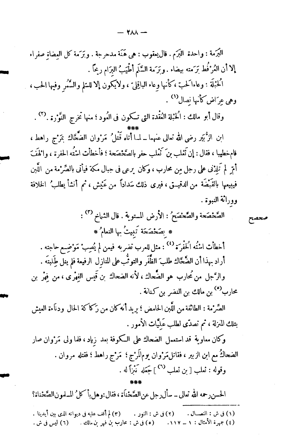 صحصح الصحصحة والصحصح: الأَرْض المستوية. قَالَ الشماخ: ... بِصَحْصَحَة تَبِيتُ بهَا النعامُ ... أَخْطَأت استه الحفرة: مثل للْعَرَب تضربه فِيمَن لم يصب مَوضِع حَاجته. أَرَادَ بِهَذَا أَن الضَّحَّاك طلب الظفر والتوثب على الْمنَازل الرفيعة فَلم ينل طلبته. وَالرجل من محَارب هُوَ الضَّحَّاك لِأَنَّهُ الضَّحَّاك بن قيس الفِهري من فهر بن محَارب بن مَالك بن النَّضر بن كنَانَة. الصِّرمة: الطَّائِفَة من اللَّبن الحامض يُرِيد أَنه كَانَ من ركاكة الْحَال ودناءة الْعَيْش بِتِلْكَ الْمنزلَة ثمَّ تصدى لطلب علَّيات الْأُمُور. وَكَانَ مُعَاوِيَة قد اسْتعْمل الضَّحَّاك على الْكُوفَة بعد زِيَاد فَلَمَّا ولى مَرْوَان صَار الضَّحَّاك مَعَ ابْن الزبير فقاتل مَرْوَان يَوْم المرج مرج راهط فَقتله مَرْوَان. وَقَوله: ثَعْلَب [بن ثَعْلَب] جعله نبزاً لَهُ. الْحسن رَحمَه الله تَعَالَى سَأَلَ رجل عَن الصَّحْناة فَقَالَ: وَهل يَأْكُل الْمُسلمُونَ الصَّحْناة