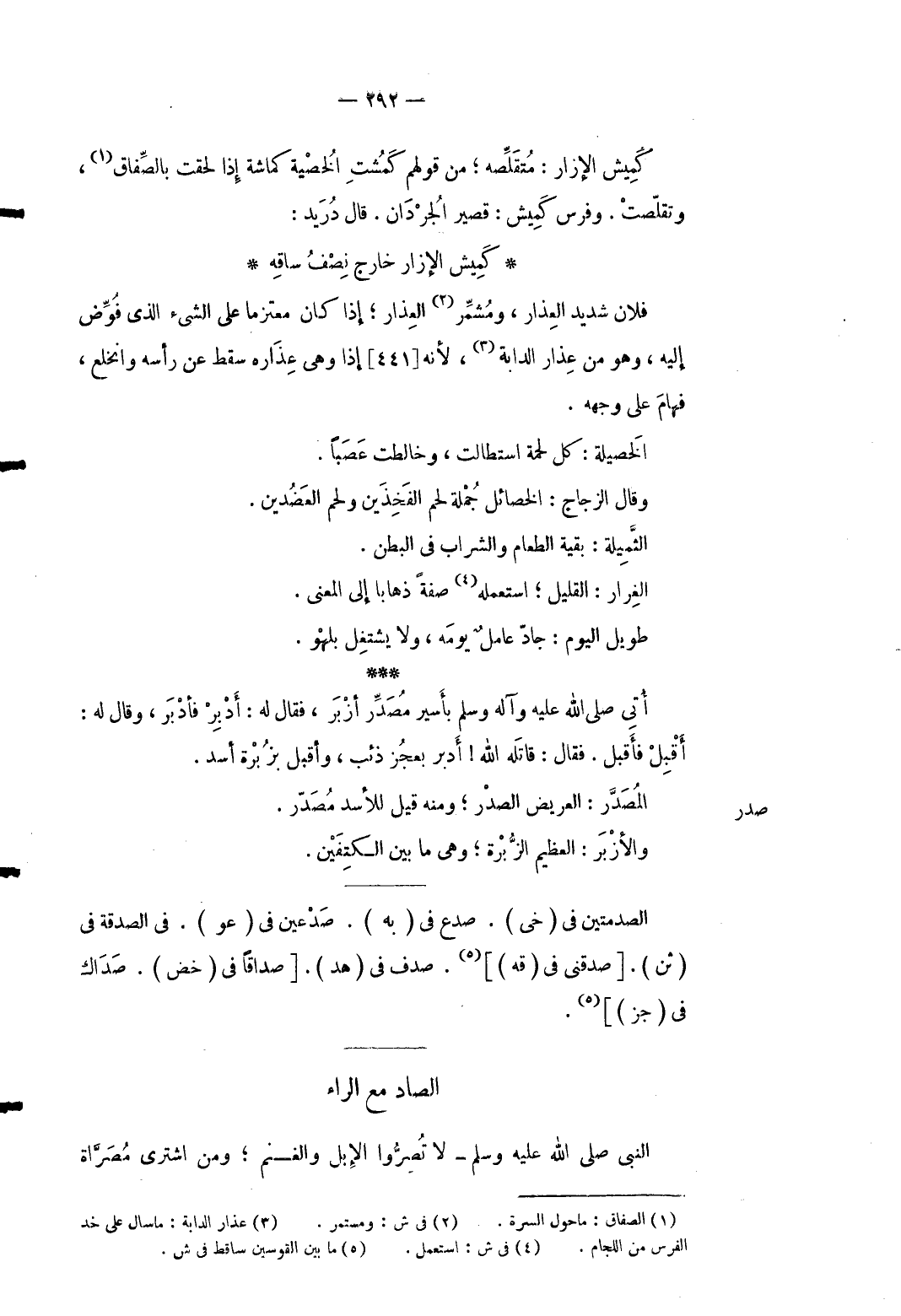 صدر المصدَّر: العريض الصَّدْر وَمِنْه قيل للأسد مصدّر. والأزبر: الْعَظِيم الزبرة وَهِي مَا بَين الْكَتِفَيْنِ. الصدمتين فِي (خي) . صدع فِي (بِهِ) . صدعين فِي (عو) . فِي الصَّدَقَة فِي (ثن) . [صدقني فِي (قه) ] . صدف فِي (هد) . [صَدَاقا فِي (خص) . صداك فِي (جز) ] .