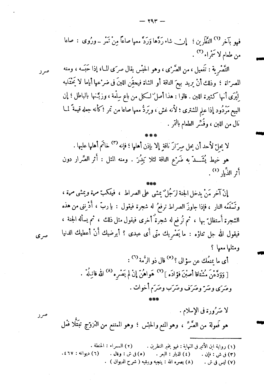 صرر التَّصرية: تفعيل من الصرى وَهُوَ الْحَبْس يُقَال صرى المَاء إِذا حَبسه وَمِنْه الْمُصراة وَذَلِكَ أَن يُرِيد بيع النَّاقة أَو الشَّاة فيحقن اللَّبن فِي ضرْعهَا أَيَّامًا لَا يحتلبه ليرى أَنَّهَا كَثِيرَة اللَّبن. قَالُوا: هَذَا أصل لكل من بَاعَ سلْعَة وزينها بِالْبَاطِلِ إِن البيع مَرْدُود إِذا علم المُشْتَرِي لِأَنَّهُ غش ويردُّ مَعهَا صَاعا من تمر كَأَنَّهُ جعله قيمَة لما نَالَ من اللَّبن وفسِّر الطَّعَام بِالتَّمْرِ. لَا يحل لأحد أَن يحل صرار نَاقَة إِلَّا بِإِذن أَهلهَا فَإِنَّهُ خَاتم أَهلهَا عَلَيْهَا. هُوَ خيط يشد بِهِ ضرع النَّاقة لِئَلَّا يدر. وَمِنْه الْمثل: أثر الصِّرار دون أثر الذيار. إِن آخر من يدْخل الْجنَّة لرجل يمشي على الصِّرَاط فَينكب مرّة وَيَمْشي مرّة وتسفعه النَّار فَإِذا جَاوز الصِّرَاط ترفع لَهُ شَجَرَة فَيَقُول: يَا رب أدنني من هَذِه الشَّجَرَة أستظل بهَا ثمَّ تُرفع لَهُ شَجَرَة أُخْرَى فَيَقُول مثل ذَلِك ثمَّ يسْأَله الْجنَّة فَيَقُول الله جلّ ثَنَاؤُهُ: مَا يصريك مني أَي عَبدِي أيرضيك أَن أُعْطِيك الدُّنْيَا وَمثلهَا مَعهَا