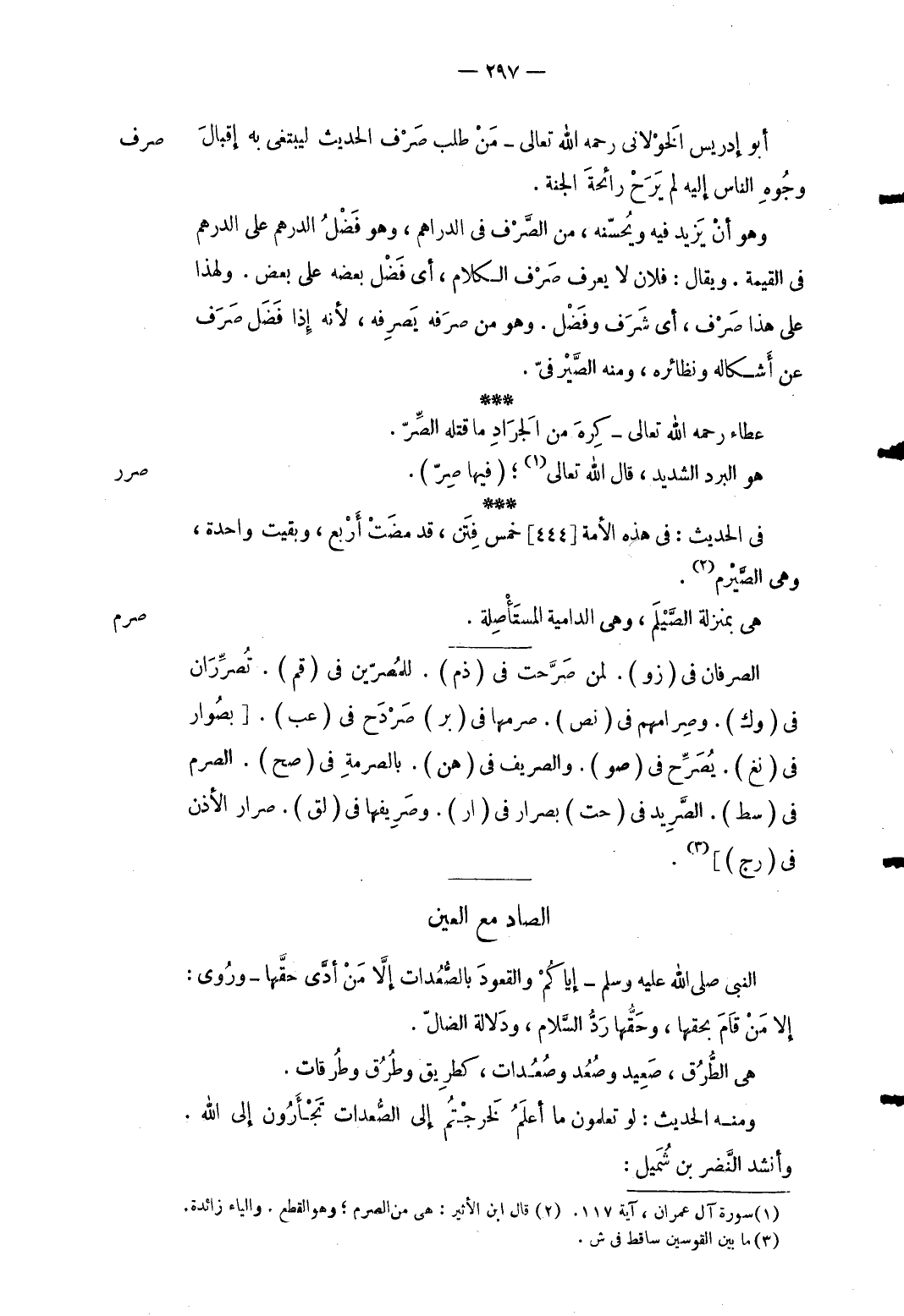 أَبُو إِدْرِيس الْخَولَانِيّ رَحمَه الله تَعَالَى من طلب صرف الحَدِيث ليبتغي بِهِ إقبال وُجُوه النَّاس إِلَيْهِ لم يرح رَائِحَة الْجنَّة. وَهُوَ أَن يزِيد فِيهِ ويحسنه من الصَّرف فِي الدَّرَاهِم وَهُوَ فضل الدِّرْهَم على الدِّرْهَم فِي الْقيمَة. وَيُقَال: فلَان لَا يعرف صرف الْكَلَام أَي فضل بعضه على بعض. وَلِهَذَا على هَذَا صرف أَي شرف وَفضل. وَهُوَ من صرفه يصرفهُ لِأَنَّهُ إِذا فضل صرف عَن أشكاله ونظائره وَمِنْه الصيرفيّ. عَطاء رَحمَه الله تَعَالَى كره من الْجَرَاد مَا قَتله الصِّرّ.