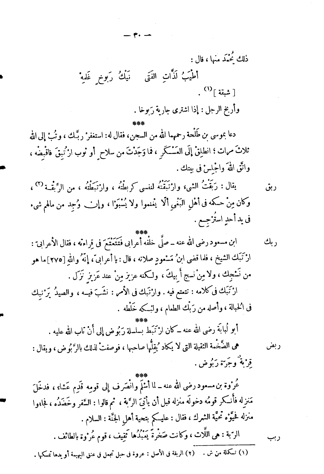 رَبك ابْن مَسْعُود رَضِي الله عَنهُ صلى خَلفه أَعْرَابِي فتتعتع فِي قِرَاءَته فَقَالَ الْأَعرَابِي: ارتبك الشَّيْخ فَلَمَّا قضى ابْن مَسْعُود صلَاته قَالَ: يَا أَعْرَابِي إِنَّه وَالله [275] مَا هُوَ من نسجك وَلَا من نسج أَبِيك وَلكنه عَزِيز من عِنْد عَزِيز نزل. ارتبك فِي كَلَامه: تتعتع فِيهِ. وارتبك فِي الْأَمر: نشب فِيهِ وَالصَّيْد يرتبك فِي الحبالة وَأَصله من رَبك الطَّعَام ولبكه خلطه. أَبُو لبَابَة رَضِي الله عَنهُ كَانَ ارْتبط بسلسلة ربوض إِلَى أَن تَابَ الله عَلَيْهِ.