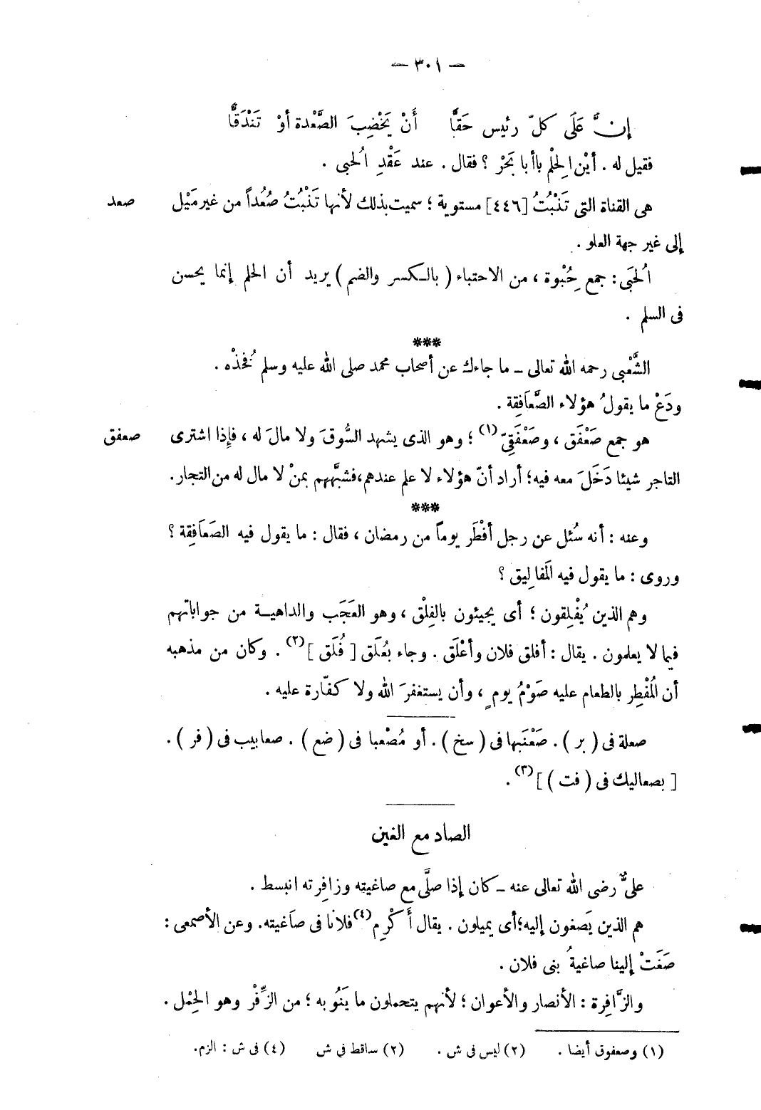 صعد هِيَ الْقَنَاة الَّتِي تنْبت [446] مستوية سميت بذلك لِأَنَّهَا تنْبت صعداً من غير ميل إِلَى غير جِهَة الْعُلُوّ. الحُبى: جمع حبوة من الاحتباء (بِالْكَسْرِ وَالضَّم) يُرِيد أَن الْحلم إِنَّمَا يحسن فِي السّلم. الشّعبِيّ رَحمَه الله تَعَالَى مَا جَاءَك عَن أَصْحَاب مُحَمَّد صلى الله عَلَيْهِ وَسلم فخذْه. ودع مَا يَقُول هَؤُلَاءِ الصعافقة.