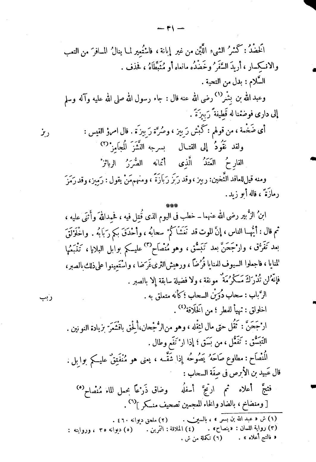 القارِحُ العَتَدُ الَّذِي ... أثمانه الصرر الربائز ... وَمِنْه قيل للعاقد الثخين: ربيز وَقد ربز ربازة وَمِنْهُم من بقول: رميز وَقد رمز رمازةً قَالَه أَبُو زيد. ابْن الزبير رَضِي الله عَنْهُمَا خطب فِي الْيَوْم الَّذِي قُتل فِيهِ فَحَمدَ الله وَأثْنى عَلَيْهِ ثمَّ قَالَ: أَيهَا النَّاس إِن الْمَوْت قد تغشاكم سحابه وأحدق بكم ربابه. واخلولق بعد تفرق وارجحن بعد تبسق وَهُوَ منصاح عَلَيْكُم بوابل البلايا تتبعها المنايا فاجعلوا السيوف للمنايا فرضا ورهيش الثرى غَرضا وَاسْتَعِينُوا على ذَلِك بِالصبرِ فَإِنَّهُ لن تدْرك مكرمَة مونقة وَلَا فَضِيلَة سَابِقَة إِلَّا بِالصبرِ.