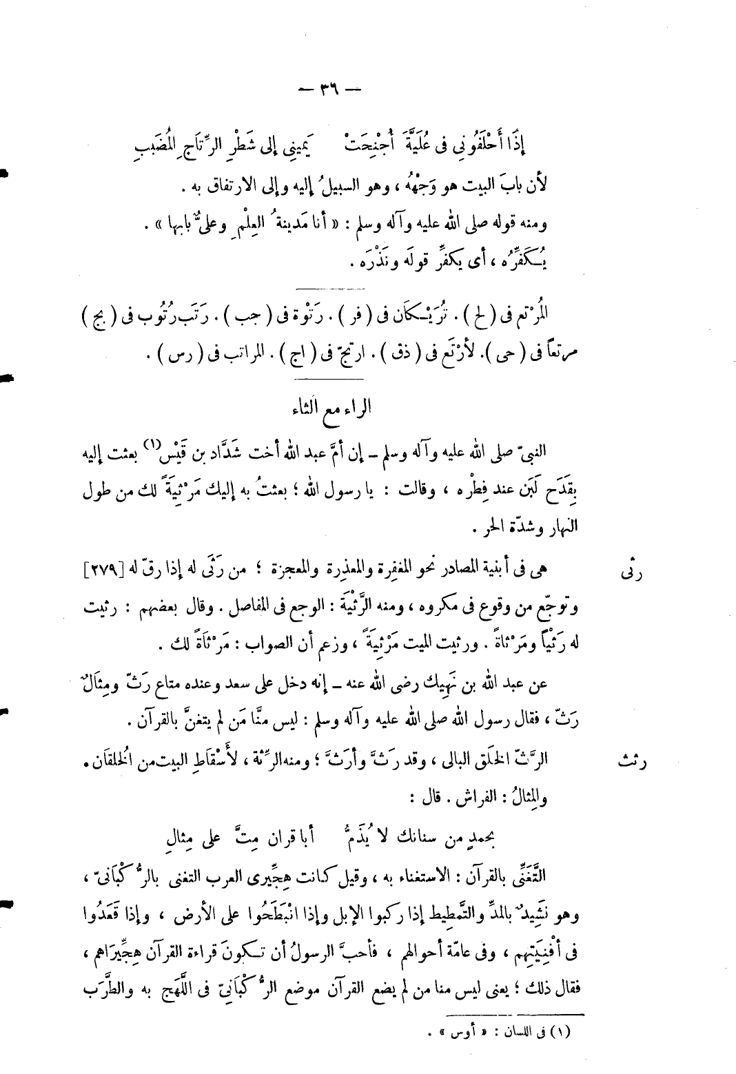 6 - ... إِذا أخلفونى فِي عُلَيَّةَ أُجْنِحَتْ ... يَمينِي إِلَى شَطْرِ الرِّتَاجِ المضب ... لِأَن بَاب الْبَيْت هُوَ وَجهه وَهُوَ السَّبِيل إِلَيْهِ وَإِلَى الارتفاق بِهِ. وَمِنْه قَوْله صلى الله عَلَيْهِ وَسلم: أَنا مَدِينَة الْعلم وعليٌ بَابهَا. يُكفره أَي يكفِّر قَوْله ونذره. المرتع فِي (لح) . تريكان فِي (فر) . رتوة فِي (جب) . رتب رتوب فِي (بج) مرتعاً فِي (حَيّ) . لأرتع فِي (ذُقْ) . ارتج فِي (اج) . الْمَرَاتِب فِي (رس) .