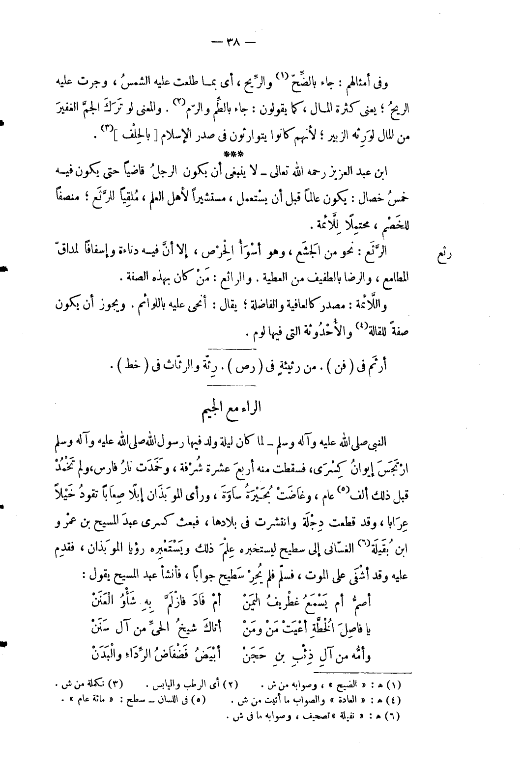 8 - وَفِي أمثالهم: جَاءَ بالضح وَالرِّيح أَي بِمَا طلعت عَلَيْهِ الشَّمْس وَجَرت عَلَيْهِ الرّيح يَعْنِي كَثْرَة المَال كَمَا يَقُولُونَ: جَاءَ بالطم والرم. وَالْمعْنَى لَو ترك الجم الْغَفِير من المَال لورثه الزبير لأَنهم كَانُوا يتوارثون فِي صدر الْإِسْلَام [بِالْحلف] . ابْن عبد الْعَزِيز رَحمَه الله تَعَالَى لَا يَنْبَغِي أَن يكون الرجل قَاضِيا حَتَّى يكون فِيهِ خمس خِصَال: يكون عَالما قبل أَن يسْتَعْمل مستشيراً لأهل الْعلم مُلقياً للرثع منصفاً للخصم مُحْتملا للأئمة.