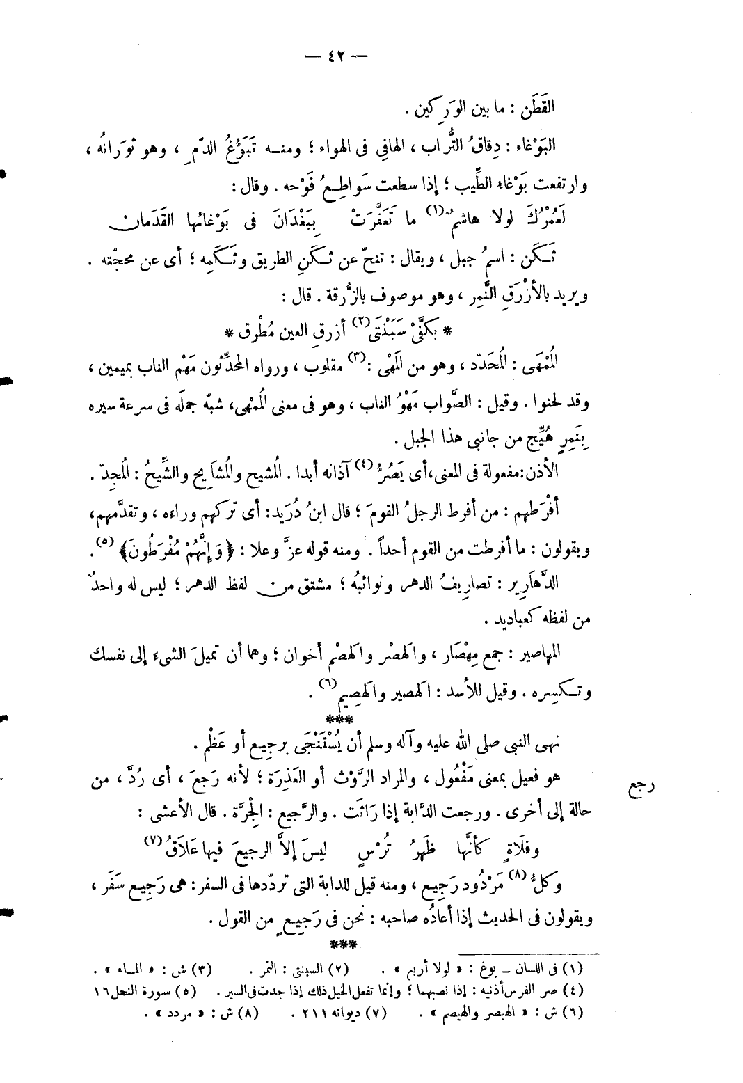 2 - الْقطن: مَا بَين الْوَرِكَيْنِ. البوغاء: دقاق التُّرَاب الهافي فِي الْهَوَاء وَمِنْه تبوغ الدَّم وَهُوَ ثورانه وَارْتَفَعت بوغاء الطّيب إِذا سطعت سواطع فوحه. وَقَالَ: ... لَعُمْرُكَ لَوْلَا هاشمٌ ... مَا تَعَفَّرَتْ بِبَغْدَانَ فِي بَوْغائها القَدَمان ... ثكن: اسْم جبل وَيُقَال: تَنَح عَن ثكن الطَّرِيق وثكمه أَي عَن محجته. وَيُرِيد بالأزرق النمر وَهُوَ مَوْصُوف بالزرقة. قَالَ: ... بكَّفْي سَبَنْتَي أزرقِ الْعين مُطْرق ... الممهى: المحدد وَهُوَ من الهر: مقلوب وَرَوَاهُ المحدثون مُهِمّ الناب بميمين وَقد لحنوا. وَقيل: الصَّوَاب مهو الناب وَهُوَ فِي معنى الممهى شبه جمله فِي سرعَة سيره بنمر هيج من جَانِبي هَذَا الْجَبَل. الْأذن: مفعولة فِي الْمَعْنى أَي يصر آذانه أبدا. المشيح والمشايح وَالشَّيْخ: الْمجد. أفرطهم: من أفرط الرجل الْقَوْم قَالَ ابْن دُرَيْد: أَي تَركهم وَرَاءه وتقدمهم وَيَقُولُونَ: مَا أفرطت من الْقَوْم أحدا. وَمِنْه قَوْله عز وَعلا: {وإِنَّهُمْ مُفْرَطُونَ} . الدهارير: تصاريف الدَّهْر ونوائبه مُشْتَقّ من لفظ الدَّهْر لَيْسَ لَهُ وَاحِد من لَفْظَة كعباديد. المهاصير: جمع مهصار والهصر والهصم أَخَوان وهما أَن تميل الشئ إِلَى نَفسك وتكسره. وَقيل للأسد: الهصير والهصيم. نهى النبى صلى الله عَلَيْهِ وَسلم أَن يستنجى برجيع أَو عظم.