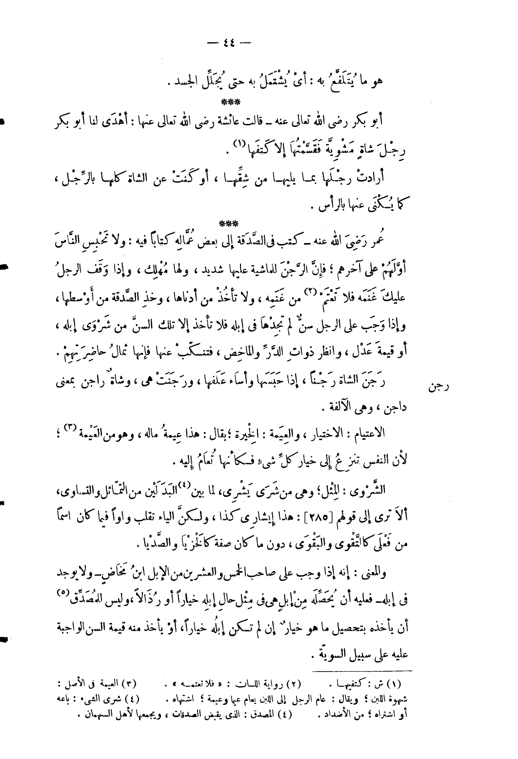 رجن رجن الشَّاة رجناً إِذا حَبسهَا وأساء عَلفهَا ورجنت هِيَ وشَاة راجن بِمَعْنى دَاجِن وَهِي الآلفة. الاعتيام: الِاخْتِيَار والعيمة: الْخيرَة يُقَال: هَذَا عيمة مَاله وَهُوَ من العيمة لِأَن النَّفس تنْزع إِلَى خِيَار كل شَيْء فَكَأَنَّهَا تعام إِلَيْهِ. الشروى: الْمثل وَهِي من شرى يشري لما بَين الْبَدَلَيْنِ من التَّمَاثُل والتساوي أَلا ترى إِلَى قَوْلهم [285] : هَذَا إيشاري كَذَا وَلَكِن الْيَاء تقلب واواً فِيمَا كَانَ اسْما من فعلى كالتقوى والبقوى دون مَا كَانَ صفة كالخزيا والصديا. وَالْمعْنَى: إِنَّه إِذا وَجب على صَاحب الْخمس وَالْعِشْرين من الْإِبِل ابْن مَخَاض وَلَا يُوجد فِي إبِله فَعَلَيهِ أَن يحصله من إبل هِيَ فِي مثل حَال إبِله خياراً أَو رذالاً وَلَيْسَ للمصدق أَن يَأْخُذهُ بتحصيل مَا هُوَ خِيَار إِن لم تكن إبِله خياراً أَو يَأْخُذ مِنْهُ قيمَة السن الْوَاجِبَة عَلَيْهِ على سَبِيل السوية