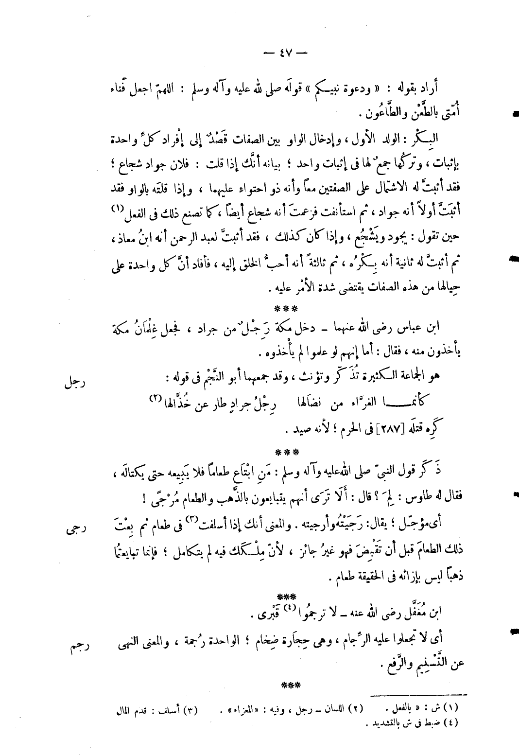 7 - أَرَادَ بقوله: ودعوة نَبِيكُم قَوْله صلى الله عَلَيْهِ وَسلم: اللَّهُمَّ اجْعَل فنَاء أمتِي بالطعن والطاعون. الْبكر: الْوَلَد الأول وَإِدْخَال الْوَاو بَين الصِّفَات قصد إِلَى إِفْرَاد كل وَاحِدَة بِإِثْبَات وَتركهَا جمع لَهَا فِي إِثْبَات وَاحِد بَيَانه أَنَّك إِذا قلت: فلَان جواد شُجَاع فقد أثبت لَهُ الاشتمال على الصفتين مَعًا وَأَنه ذُو احتواء عَلَيْهِمَا وَإِذا قلته بِالْوَاو فقد أثبت أَولا أَنه جواد ثمَّ استأنفت فَزَعَمت أَنه شُجَاع أَيْضا ن كَمَا تصنع ذَلِك فِي الْفِعْل حِين تَقول: يجود ويشجع وَإِذا كَانَ كَذَلِك فقد أثبت لعبد الرَّحْمَن أَنه ابْن معَاذ ثمَّ أثبت لَهُ ثَانِيَة أَنه بكره ثمَّ ثَالِثَة أَنه أحب الْخلق إِلَيْهِ فَأفَاد أَن كل وَاحِدَة على حيالها من هَذِه الصِّفَات يَقْتَضِي شدَّة الْأَمر عَلَيْهِ. ابْن عَبَّاس رَضِي الله عَنْهُمَا دخل مَكَّة رجل من جَراد فَجعل غلْمَان مَكَّة يَأْخُذُونَ مِنْهُ فَقَالَ: أما إِنَّهُم لَو علمُوا لم يأخذوه.