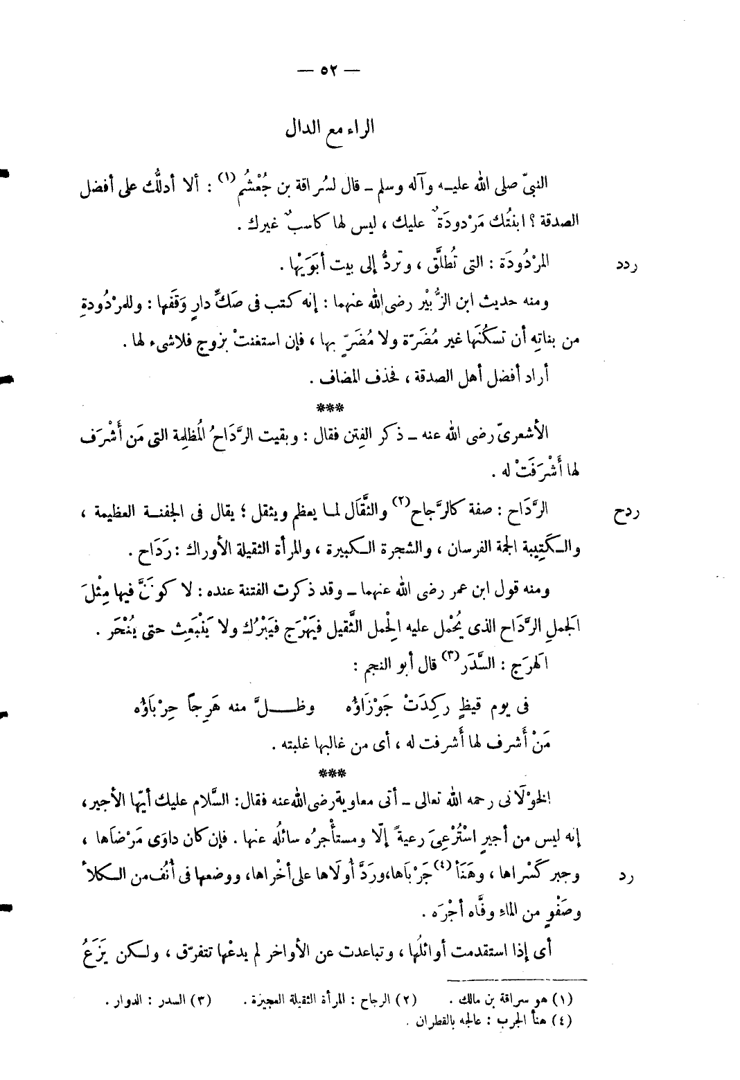 ردد الْمَرْدُودَة: الَّتِي تُطَّلق وَترد إِلَى بَيت أَبَوَيْهَا. وَمِنْه حَدِيث ابْن الزبير رَضِي الله عَنْهُمَا: إِنَّه كتب قى صكِّ دارٍ وَقفهَا: وللمردودة من بَنَاته أَن تسكنها غير مضرَّة وَلَا مُضر بهَا فَإِن استغنت بِزَوْج فَلَا شَيْء لَهَا. أَرَادَ أفضل أهل الصَّدَقَة فَحذف الْمُضَاف. الْأَشْعَرِيّ رَضِي الله عَنهُ ذكر الْفِتَن فَقَالَ: وَبقيت الرداح الْمظْلمَة الَّتِى من أشرف لَهَا أشرفت لَهُ.
