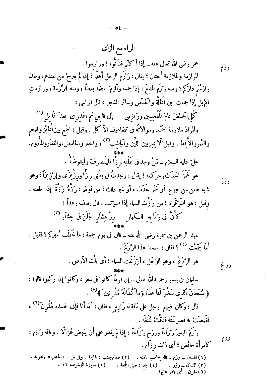 رزغ هُوَ الردع وَهُوَ الوحل أرزغت السَّمَاء أَي بلت الأَرْض. سُلَيْمَان بن يساررحمه الله تَعَالَى إِن قوما كَانُوا فِي سفر وَكَانُوا إِذا ركبُوا قَالُوا: {سُبْحَانَ الذِي سَخَّرَ لَنَا هذَا وَمَا كُنَّا لَهُ مُقْرِنينَ} . قَالَ: وَكَانَ فيهم رجل على نَاقَة لَهُ رازم فَقَالَ: أما أَنا فإنى لهَذِهِ مقرن فقمصت بِهِ فصرعته فدقت عُنُقه.