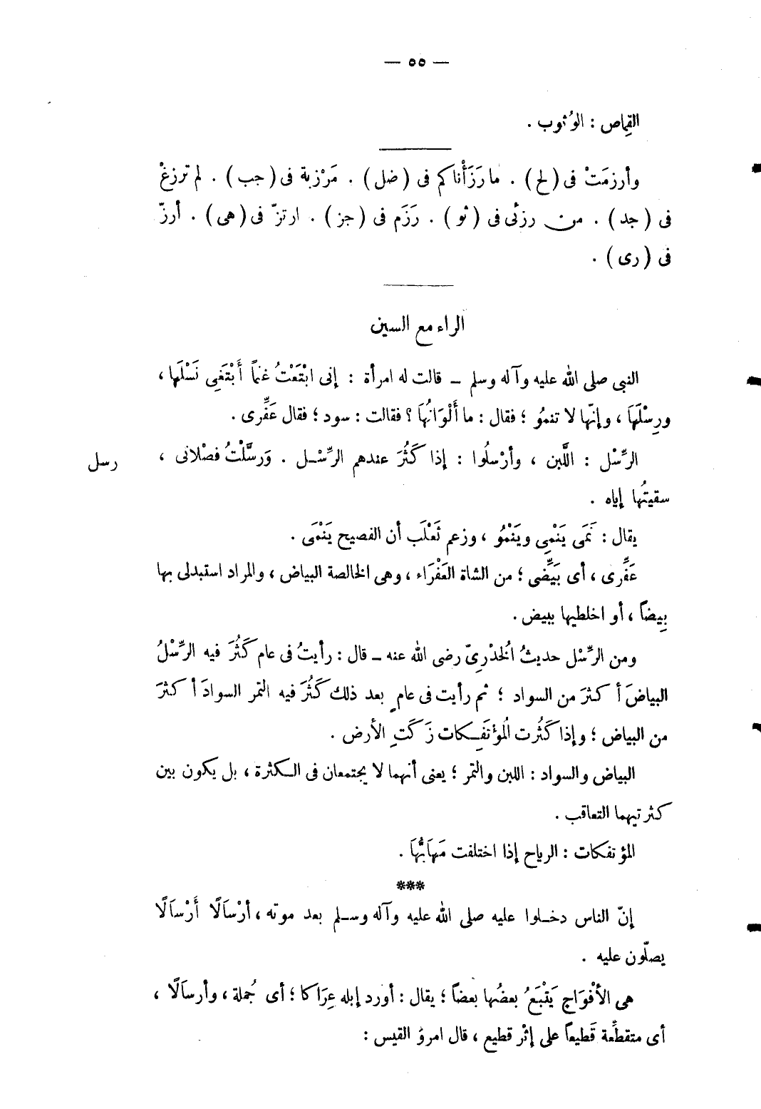 رسل الرُّسُل: اللين وَأَرْسلُوا: إِذا كثر عِنْدهم الرُّسُل ورسلت فصلاني سقيتها إِيَّاه. يُقَال: نمى ينمي وينمو وَزعم ثَعْلَب أَن الفصيح ينمي. عفِّري أَي بيضي من الشَّاة العفراء وَهِي الْخَالِصَة الْبيَاض وَالْمرَاد استبدلي بهَا بيضًا أَو اخلطيها ببيض. وَمن الرُّسُل حَدِيث الْخُدْرِيّ رَضِي الله عَنهُ قَالَ: رَأَيْت فِي عَام كثر فِيهِ الرُّسُل الْبيَاض أَكثر من السوَاد ثمَّ رَأَيْت فِي عامٍ بعد ذَلِك كثر فِيهِ التَّمْر السوَاد أَكثر من الْبيَاض وَإِذا كثرت الْمُؤْتَفِكَات زكتْ الأَرْض. الْبيَاض والسواد: اللَّبن زالتمر يَعْنِي أَنَّهُمَا لَا يَجْتَمِعَانِ فِي الْكَثْرَة بل يكون بَين كثرتيهما التَّعَاقُب. الْمُؤْتَفِكَات: الرِّيَاح إِذا اخْتلفت مهابها إِن النَّاس دخلُوا عَلَيْهِ صلى الله عَلَيْهِ وَسلم بعد مَوته أَرْسَالًا أَرْسَالًا يصلونَ عَلَيْهِ. هِيَ الأفواج يتبع بَعْضهَا بَعْضًا يُقَال: أورد إبِله عراكا أَي جملَة وأرسالاً أَي متقطعة قطيعاً على إِثْر قطيع قَالَ امْرُؤ الْقَيْس: