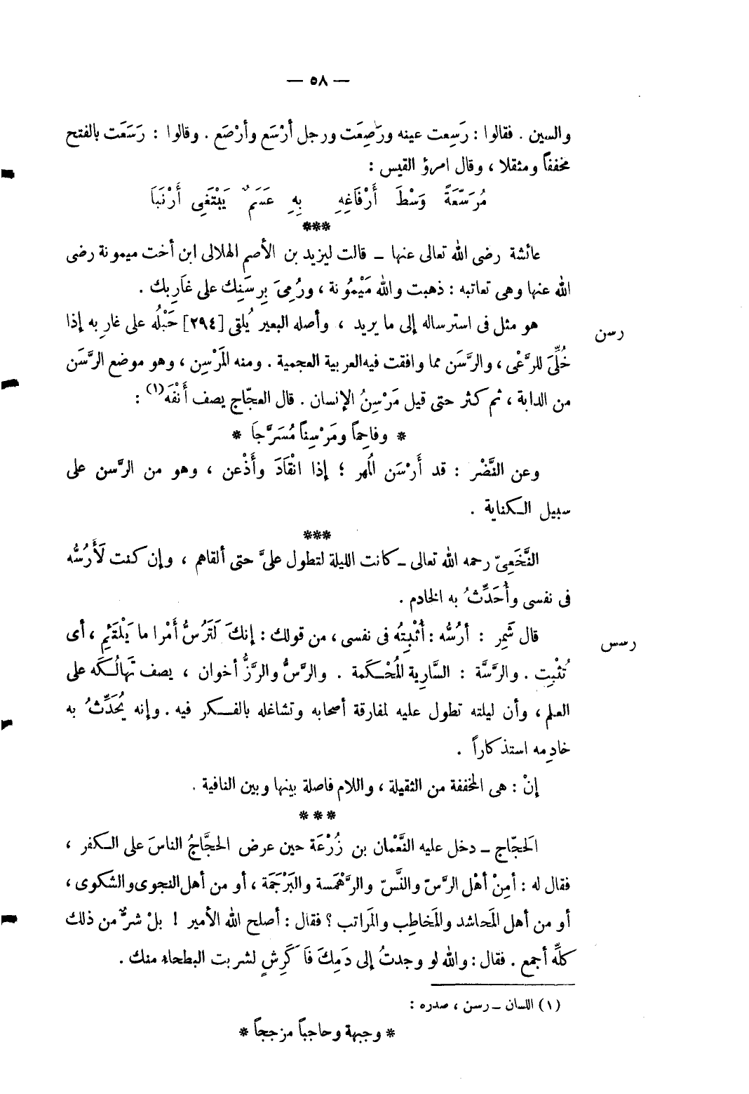 رسس قَالَ شمر: أرسُّه: أُثبته فِي نَفسِي من قَوْلك: إِنَّك لترسُّ أمرا مَا يلتئم أَي تثبت. والرَّسة: السَّارية المحكمة. والرَّس والرَّز أَخَوان يصف تهالكه على الْعلم وَأَن ليلته تطول عَلَيْهِ لمفارقة أَصْحَابه وتشاغله بالفكر فِيهِ وَإنَّهُ يُحدِّثُ بِهِ خادمه استذكاراً. إنْ: هِيَ المخففة من الثَّقِيلَة وَاللَّام فاصلة بَينهَا وَبَين النافية. الْحجَّاج دخل عَلَيْهِ النُّعْمَان بن زرْعَة حِين عرض الْحجَّاج النَّاس على الْكفْر فَقَالَ لَهُ: أَمن أهل الرَّس والنَّسّ والرَّهمسة والبرجمة أَو من أهل النَّجْوَى والشكوى أَو من أهل المحاشد والمخاطب والمراتب فَقَالَ: أصلح الله الْأَمِير بل شرٌّ من ذَلِك كُله أجمع. فَقَالَ: وَالله لَو وجدت إِلَى دمك فاكرش لشربت الْبَطْحَاء مِنْك.