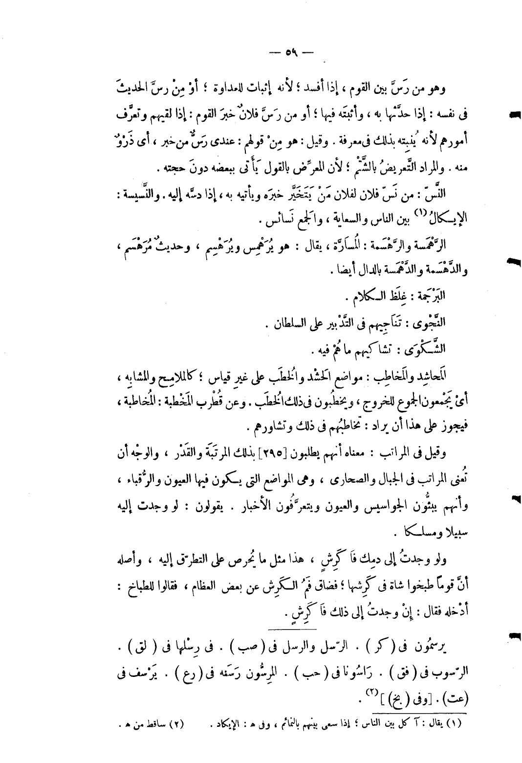 9 - وَهُوَ من رس بَين الْقَوْم إِذا أفسد لِأَنَّهُ إِثْبَات للعداوة أَو من رس الحَدِيث فِي نَفسه: إِذا حدثها بِهِ وأثبته فِيهَا أَو من رس فلَان خبر الْقَوْم: إِذا لَقِيَهُمْ وتعرَّف أُمُورهم لِأَنَّهُ ينبته بذلك فِي معرفَة وَقيل: هُوَ من قَوْلهم: عِنْدِي رس من خبر أَي ذرو مِنْهُ. وَالْمرَاد التَّعْرِيض بالشتم لِأَن المعرِّض بالْقَوْل يَأْتِي بِبَعْضِه دون حجَّته. النس: من نس فلَان لفُلَان من يتَخَيَّر خَبره وياتيه بِهِ إِذا دسَّه إِلَيْهِ. والنسيسة: الإيكال بَين النَّاس والسعاية وَالْجمع نسائس. الرَّهْمَسة والرهسمة: المسارَّة يُقَال: هُوَ يرهمس ويرهسم وَحَدِيث مرهسم والدهسمة والدهمسة بِالدَّال أَيْضا. البرجمة: غلظ الْكَلَام. النَّجْوَى: تناجيهم فِي التَّدْبِير على السُّلْطَان. الشكوى: تشاكيهم مَا هم فِيهِ. المحاشد والمخاطب: مَوَاضِع الحشد والخطب على غير قِيَاس كالملامح والمشابه أَي يجمعُونَ الجموع لِلْخُرُوجِ ويخطبون فِي ذَلِك الْخطب. وَعَن قطرب المخطبة: المخاطبة فَيجوز على هَذَا أَن يُرَاد: تخاطبهم فِي ذَلِك وتشاورهم. وَقيل فِي الْمَرَاتِب: مَعْنَاهُ أَنهم يطْلبُونَ [295] بذلك الْمرتبَة وَالْقدر وَالْوَجْه أَن تَعْنِي الْمَرَاتِب فِي الْجبَال والصحارى وَهِي الْمَوَاضِع الَّتِي يكون فِيهَا الْعُيُون والرقباء وَأَنَّهُمْ يبثون الجواسيس والعيون ويتعرفون الْأَخْبَار. يَقُولُونَ: لَو وجدت إِلَيْهِ سَبِيلا ومسلكا. وَلَو وجدت إِلَى دمك فاكرش هَذَا مثل مَا يحرص على التطرق إِلَيْهِ وَأَصله أَن قوما طبخوا شَاة فِي كرشها فَضَاقَ فَم الكرش عَن بعض الْعِظَام فَقَالُوا للطباخ: أدخلهُ فَقَالَ: إِن وجدت إِلَى ذَلِك فاكرش. يرسمون فِي (كرّ) . الرّسل وَالرسل فِي (صب) . فِي رسلها فِي (لق) . الرّسوب فِي (فق) . راسونا فِي (حب) . المرسُّون رسنه فِي (رع) . يرسف فى (عت) . [وفى (نج) ] .