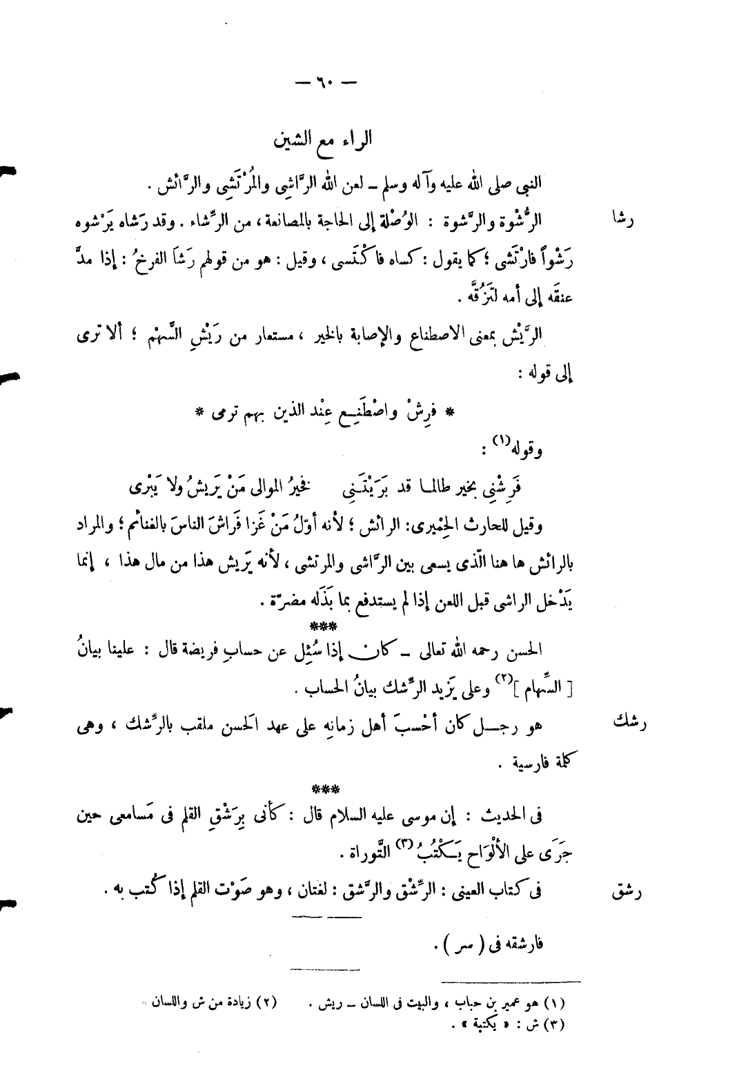 رشا الرِّشْوَة والرشوة: الوصلة إِلَى الْحَاجة بالمصانعة من الرشاء. وَقد رشاه يرشوه رشواً فارتشى كَمَا يَقُول: كَسَاه فاكتسى وَقيل: هُوَ من رشا الفرخ: إِذا مد عُنُقه إِلَى أمه لتزقه. الريش بِمَعْنى الاصطناع والإصابة بِالْخَيرِ مستعار من ريش السهْم أَلا ترى إِلَى قَوْله: ... فرِشْ واصْطَنِع عِنْد الَّذين بهم ترمي ... وَقَوله: ... فَرِشْنِي بِخَير طالما قد بَرَيْتَنِي ... فخيرُ الموَالِي مَنْ يَريشُ وَلَا يَبْري ... وَقيل لِلْحَارِثِ الْحِمْيَرِي: الرائش لِأَنَّهُ أول من غزر فرَاش النَّاس بالغنائم وَالْمرَاد بالرائش هَا هُنَا الذى يسْعَى بَين الراشى والمرتشى لِأَنَّهُ يريش هَذَا من قَالَ هَذَا إِنَّمَا يدْخل الراشي قبل اللَّعْن إِذا لم يستدفع بِمَا بذله مضرّة. الْحسن رَحمَه الله تَعَالَى كَانَ إِذا سُئل عَن حِسَاب فَرِيضَة قَالَ: علينا بَيَان [السِّهَام] وعَلى يزِيد الرشك بَيَان الْحساب.