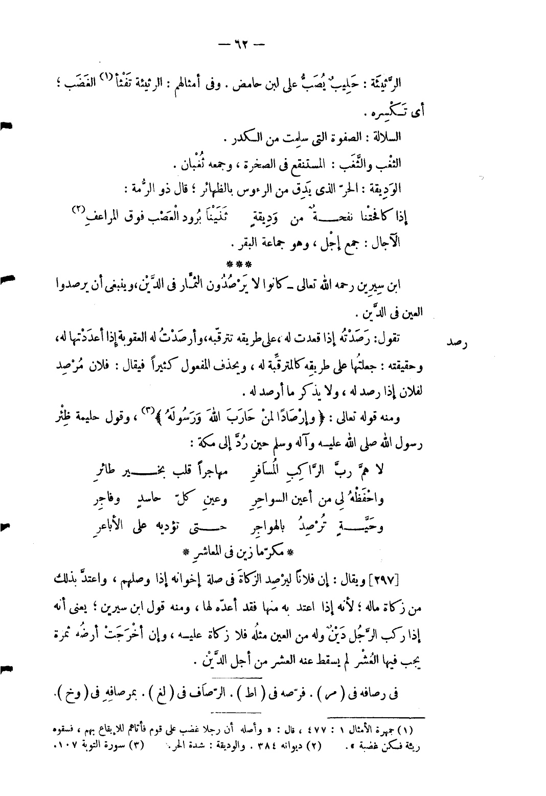 2 - الرثيئة: حليب يصب على لبن حامض. وَفِي أمثالهم: الرثيئة تفثأ الْغَضَب أَي تكسره. السلالة: الصفوة الَّتِي سلمت من الكدر. الثْغب والثَّغَب: المستنقع فِي الصَّخْرَة وَجمعه ثُغبان. الوديقة: الْحر الَّذِي يدق من الرُّءُوس بالظهائر قَالَ ذُو الرمة: ... إِذا كافحتْنا نفحةٌ من وَدِيقةٍ ... ثَنَيْنَا بُرود الْعَصْب فَوق المراعفِ ... الْآجَال: جمع أجل وَهُوَ جمَاعَة الْبَقر. ابْن سِيرِين رَحمَه الله تَعَالَى كَانُوا لَا يرصدون الثِّمَار فِي الدّين وينبغى أَن يرصدوا الْعين فى الدّين.