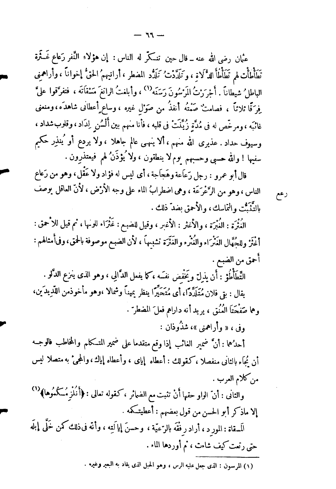 رعع النَّاس وَهُوَ من الرعرعة وَهِي اضْطِرَاب المَاء على وَجه الأَرْض لِأَن الْعَاقِل يُوصف بالتثبت والتماسك والأحمق بضد ذَلِك. الغثرة: الغبرة والأغثر: الأغبر وَقيل للضبع: غثراء للونها ثمَّ قيل للأحمق: أغثر وللجهال الغثراء والغثرء والغثرة تشبها لِأَن الضبع مَوْصُوفَة بالحمق وَفِي أمثالهم أَحمَق من الضبع. التطأطؤ: أَن يذل ويخفض نَفسه كَمَا يفعل الدالي وَهُوَ الَّذِي ينْزع الدَّلْو. يُقَال بَقِي فلَان متلددا أَي متحيرا ينظر يَمِينا وَشمَالًا وَهُوَ مَأْخُوذ من اللديدين وهما صفحتا الْعُنُق يُرِيد لِأَنَّهُ داراهم فعل الْمُضْطَر. وَفِي وأراهمني شذوذان: أَحدهمَا: أَن ضمير الْغَائِب إِذا وَقع مُتَقَدما على ضمير الْمُتَكَلّم والمخاطب فَالْوَجْه أَن يجاء بِالثَّانِي مُنْفَصِلا كَقَوْلِك: أعطَاهُ إيَّايَ وَأَعْطَاهُ إياك والمجيء بِهِ مُتَّصِلا لَيْسَ من كَلَام الْعَرَب. وَالثَّانِي: أَن الْوَاو حَقّهَا أَن تثبت مَعَ الضمائر كَقَوْلِه تَعَالَى: {أَنُلْزِمُكُمُوها} إِلَّا مَا ذكر أَبُو الْحسن من قَول بَعضهم: أعطيتكمه. المسقاة: المورد أَرَادَ رفقه بالرعية وَحسن إيالته وَأَنه فِي ذَلِك كمن خلَّى إبِله حَتَّى رتعت كَيفَ شَاءَت ثمَّ أوردهَا المَاء.