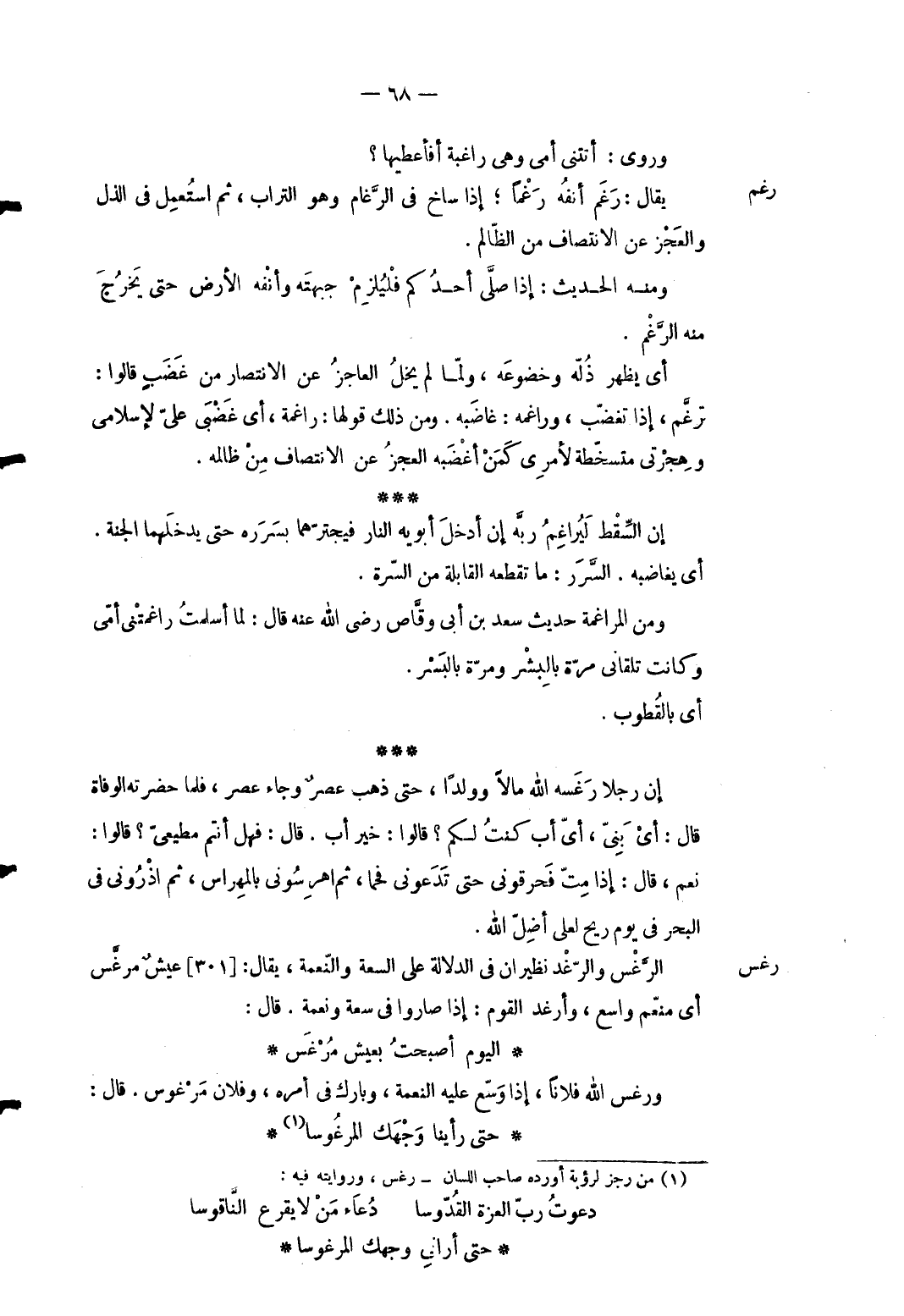 رغم يُقَال: رغم أَنفه رغماً إِذا ساخ فِي الرَّغام وَهُوَ التُّرَاب ثمَّ اسْتعْمل فِي الذل وَالْعجز عَن الانتصاف من الظَّالِم. وَمِنْه الحَدِيث: إِذا صلى أحدكُم فليلزم جَبهته وَأَنْفه الأَرْض حَتَّى يخرج مِنْهُ الرَّغم. أَي يظْهر ذله وخضوعه وَلما لم يخل الْعَاجِز عَن الِانْتِصَار من غضب قَالُوا: ترغَّم إِذا تغْضب وراغمه: غاضبه. وَمن ذَلِك قَوْلهَا: راغمة أَي غَضبى عليّ لإسلامي وهجرتي متسخطة لأمري كمن أغضبهُ الْعَجز عَن الانتصاف من ظالمه. إِن السقط ليراغم ربه إِن أَدخل أَبَوَيْهِ النَّار فيجترهما بسرره حَتَّى يدخلهما الْجنَّة. أَي يغاضبه. السرر: مَا تقطعه الْقَابِلَة من السُّرَّة. وَمن المراغمة حَدِيث سعد بن أبي وَقاص رَضِي الله عَنهُ قَالَ: لما أسلمت راغمتني أُمِّي وَكَانَت تَلقانِي مرّة بالبشر وَمرَّة بالبسر. أَي بالقطوب. إِن رجلا رغسه الله مَالا وَولدا حَتَّى ذهب عصر وَجَاء عصر فَلَمَّا حَضرته الْوَفَاة قَالَ: أَي بني أَي أَب كنت لكم قَالُوا: خير أَب. قَالَ: فَهَل انتم مطيعي قَالُوا: نعم قَالَ: إِذا مت فحرقوني حَتَّى تَدعُونِي فحما ثمَّ اهرسوني بالمهراس ثمَّ اذروني فِي الْبَحْر فِي يَوْم ريح لعَلي أضلّ الله.