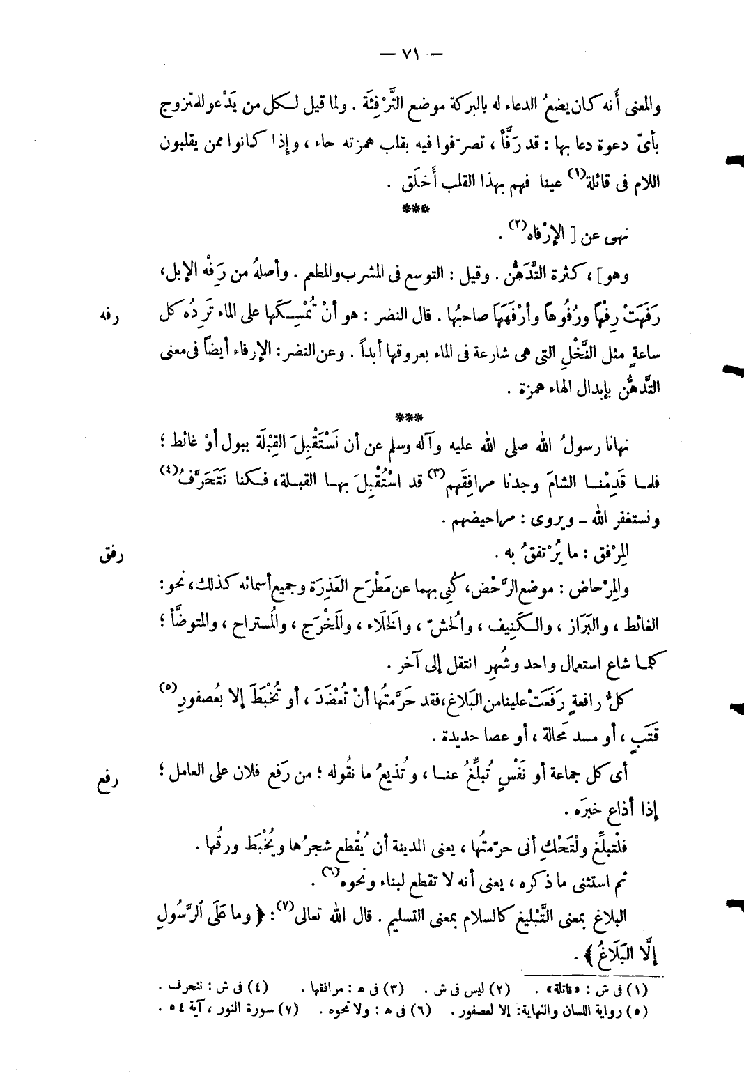 1 - وَالْمعْنَى أَنه كَانَ يضع الدُّعَاء لَهُ بِالْبركَةِ مَوضِع الترفئة وَلما قيل لكل من يَدْعُو للمتزوج بِأَيّ دَعْوَة دَعَا بهَا: قد رفأ تصرفوا فِيهِ بقلب همزته حاء وَإِذا كَانُوا مِمَّن يقلبون اللَّام فِي قائلة عينا فهم بِهَذَا الْقلب أخلق. نهى عَن [الإرفاه وَهُوَ] كَثْرَة التدهن. وَقيل: التَّوَسُّع فِي المشرب والمطعم وَأَصله من رفه الْإِبِل