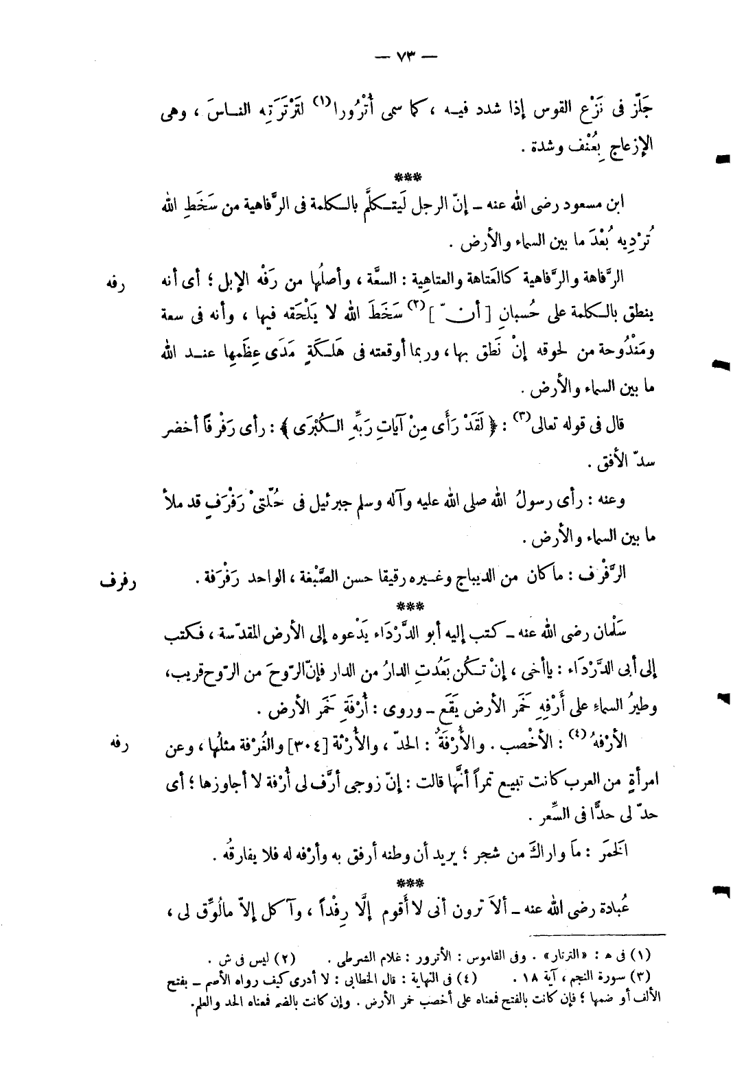 رفه الرفاهة والرفاهية كالعتاهة والعتاهية: السعَة وَأَصلهَا من رفه الْإِبِل أَي أَنه ينْطق بِالْكَلِمَةِ على حُسبان [أَن] سخط الله لَا يلْحقهُ فِيهَا وَأَنه فِي سَعَة ومندوحة من لُحُوقه إِن نطق بهَا وَرُبمَا أوقعته فِي هلكة مدى عظمها عِنْد الله مَا بَين السَّمَاء وَالْأَرْض. قَالَ فِي قَوْله تَعَالَى: {لَقَدْ رَأَى مِنْ آياتِ رَبِّهِ الكُبْرَى} : رأى رفرفاً أَخْضَر سد الْأُفق. وَعنهُ: رأى رَسُول الله صلى الله عَلَيْهِ وَسلم جبرئيل فِي حُلتي رَفْرَف قد مَلأ مَا بَين السَّمَاء وَالْأَرْض.