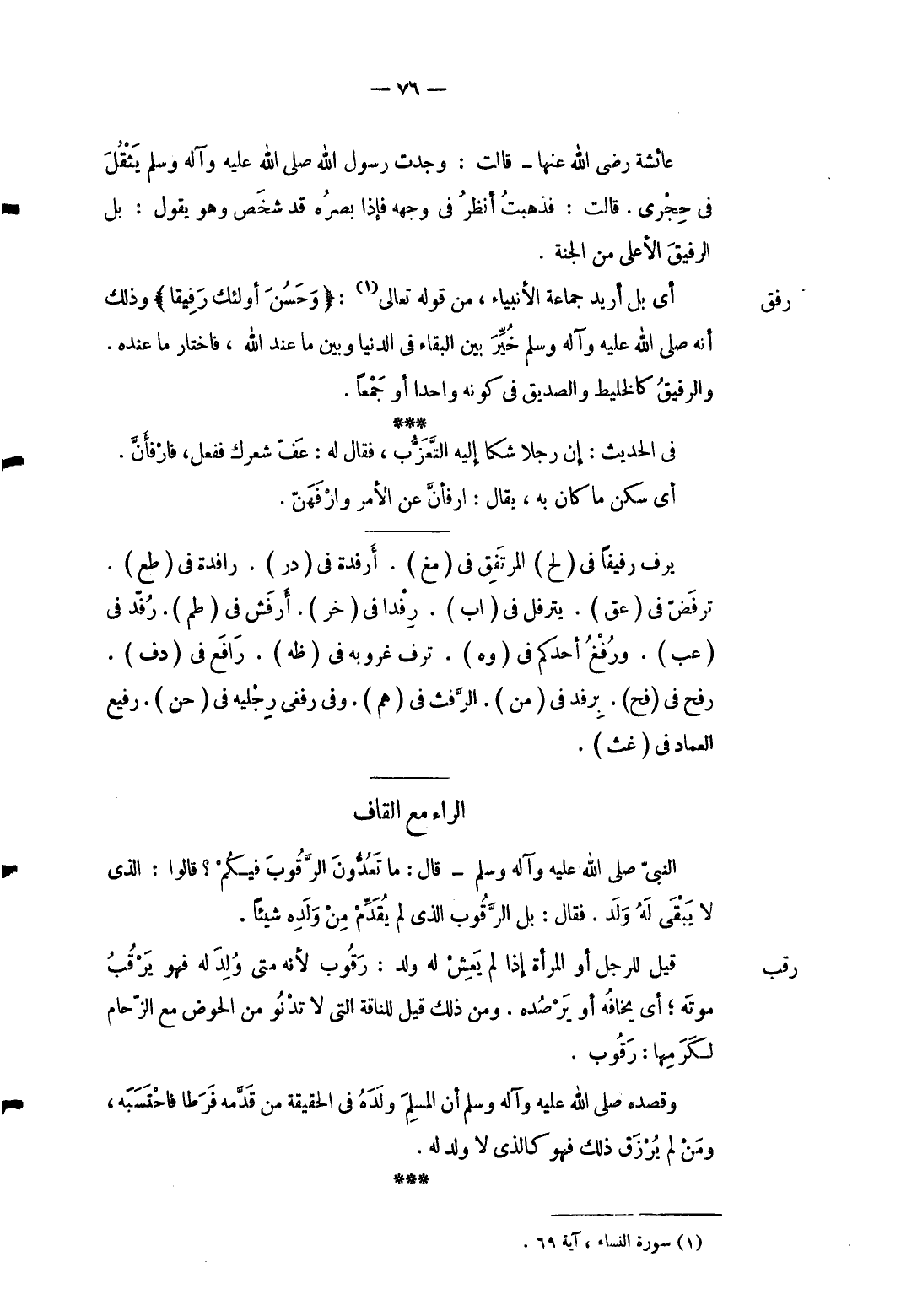 رفق أَي بل أُرِيد جمَاعَة الْأَنْبِيَاء من قَوْله تَعَالَى: {وَحَسُنَ أُولَئِكَ رَفِيقا} وَذَلِكَ أَنه صلى الله عَلَيْهِ وَسلم خُيَّر بَين الْبَقَاء فِي الدُّنْيَا وَبَين مَا عِنْد الله فَاخْتَارَ مَا عِنْده والرفيق كالخليط وَالصديق فِي كَونه وَاحِدًا أَو جمعا. فِي الحَدِيث: إِن رجلا شكا إِلَيْهِ التعزب فَقَالَ لَهُ: عف شعرك فَفعل فارفأنَّ. أَي سكن مَا كَانَ بِهِ يُقَال: ارفأنَّ عَن الْأَمر وارفهنّ. يرف رفيفاً فِي (لح) المرتفق فِي (مغ) . أرفدة فِي (در) . رافدة فِي (طع) . ترفض فِي (عق) . يترفل فِي (اب) . رفدا فِي (خر) . أرفش فِي (طم) . رُفّد فِي (عب) . ورفغ أحدكُم فِي (وه) . ترف غروبه فِي (ظه) . رَافع فِي (دف) . رفح فِي (فح) . برفد فِي (من) . الرَّفث فِي (هم) . وَفِي رفغي رجلَيْهِ فِي (حن) . رفيع الْعِمَاد فِي (غث) .