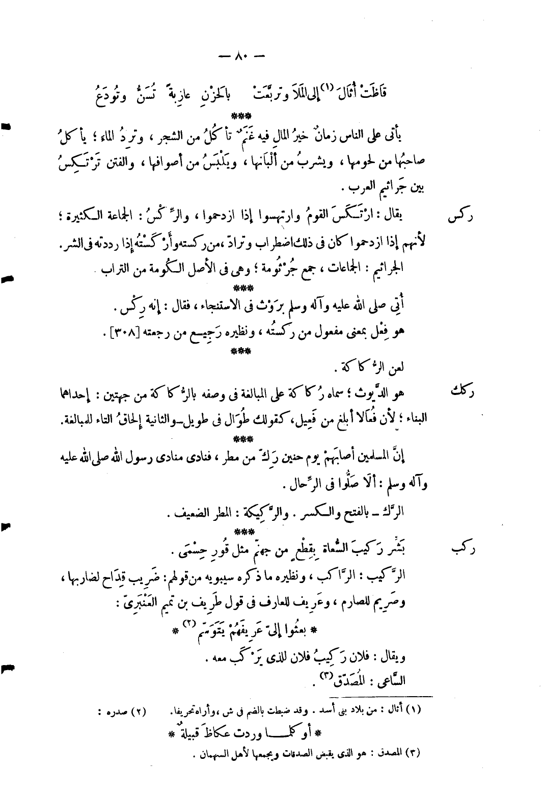 ركب بشر ركيب السعاة بِقطع من جَهَنَّم مثل قور حسمي. الركيب: الرَّاكِب وَنَظِيره مَا ذكره سِيبَوَيْهٍ من قَوْلهم: ضريب قداح لضاربها وصريم للصارم وعريف للعارف فِي قَول طريف بن تَمِيم الْعَنْبَري: ... بعثُوا إليّ عَرِيفَهُمْ يَتَوَسّم ... وَيُقَال: فلَان ركيب فلَان للذى يركب مَعَه. السَّاعِي: الْمُصدق.
