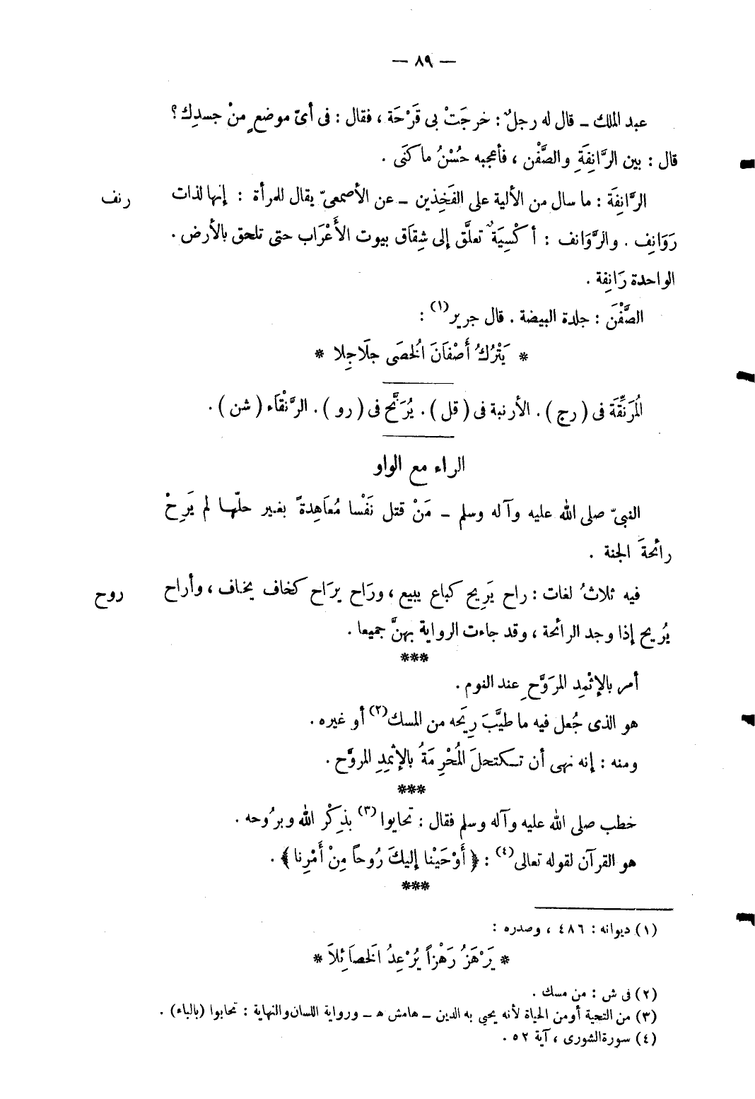 روح فِيهِ ثَلَاث لُغَات: رَاح يرِيح كباع يَبِيع وَرَاح يراح كخاف يخَاف وأراح يرِيح إِذا وجد الرَّائِحَة وَقد جَاءَت الرِّوَايَة بِهن جَمِيعًا. أَمر بالإثمد المروح عِنْد النّوم. هُوَ الذى جعل فِيهِ مَا طيب رِيحه من الْمسك أَو غَيره. وَمِنْه: إِنَّه نهى أَن تكتحل الْمُحرمَة بالإثمد المروح. خطب صلى الله عَلَيْهِ وَسلم فَقَالَ: تحايوا بِذكر الله وبروحه. هُوَ الْقُرْآن لقَوْله تَعَالَى: {أَوْحَيْنا إليكَ رُوحاً مِنْ أمرنَا} .
