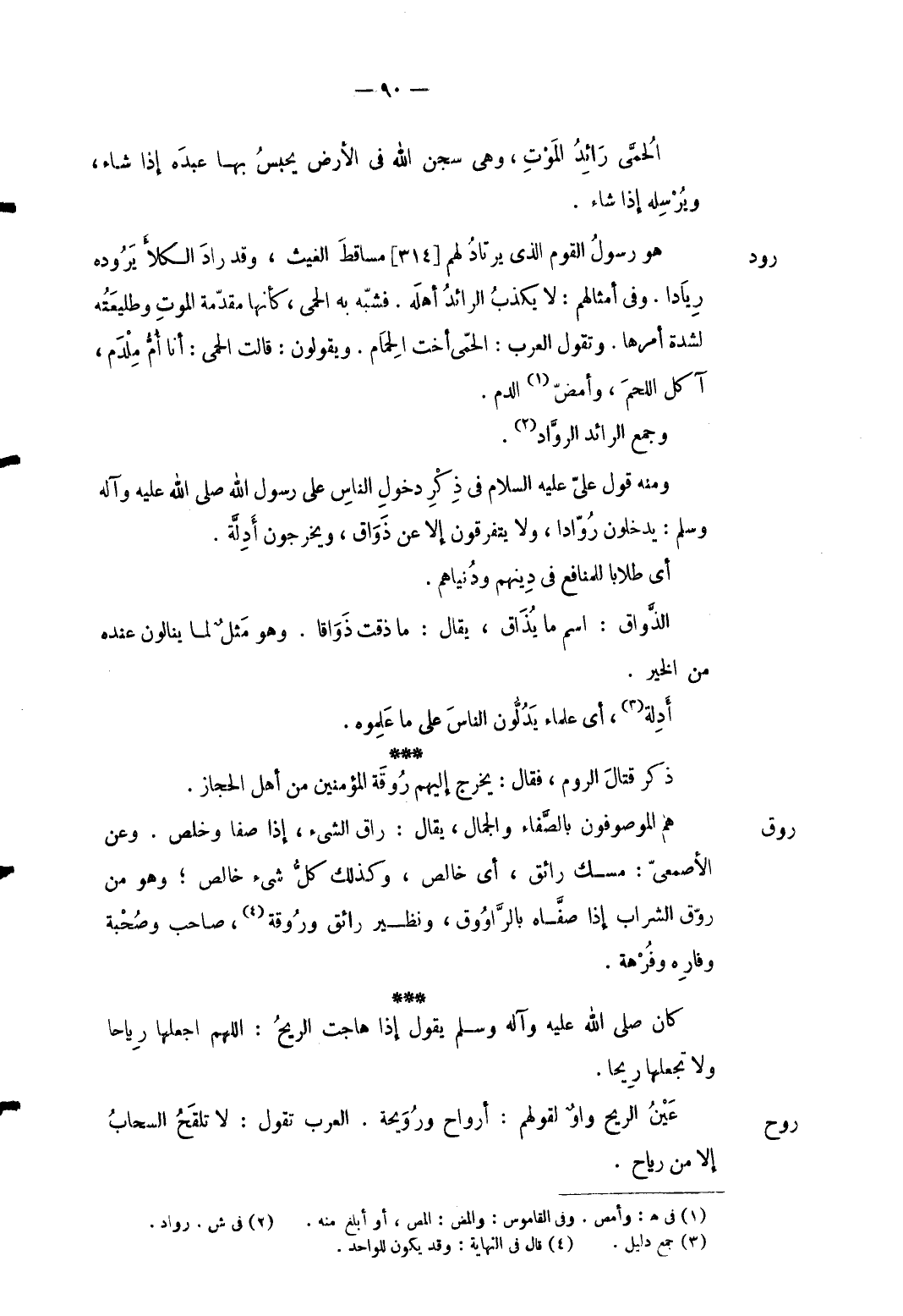 رَود هُوَ رَسُول الْقَوْم الَّذِي يرتاد لَهُم [314] مساقط الْغَيْث وَقد راد الْكلأ يروده ريادا وَفِي أمثالهم: لَا يكذب الرائد أَهله. فَشبه بِهِ الْحمى كَأَنَّهَا مُقَدّمَة الْمَوْت وطليعته لشدَّة أمرهَا. وَتقول الْعَرَب: الْحمى أُخْت الْحمام. وَيَقُولُونَ: قَالَت الْحمى: أَنا أم ملدام آكل اللَّحْم وأمض الدَّم. وَجمع الرائد الرواد. وَمِنْه قَول عَليّ عَلَيْهِ السَّلَام فِي ذكر دُخُول النَّاس على رَسُول الله عَلَيْهِ وَآله وَسلم: يدْخلُونَ رَوَّادًا وَلَا يتفرقون إِلَّا عَن ذواق وَيخرجُونَ أَدِلَّة. أَي طلابا للمنافع فِي دينهم ودنياهم. الذَّواق: اسْم مَا يذاق يُقَال: مَا ذقت ذواقا. وَهُوَ مثل لما ينالون عِنْده من الْخَيْر. أَدِلَّة أَي عُلَمَاء يدلُّون النَّاس على مَا علموه. ذكر قتال الرّوم فَقَالَ: يخرج إِلَيْهِم روقة الْمُؤمنِينَ من أهل الْحجاز.