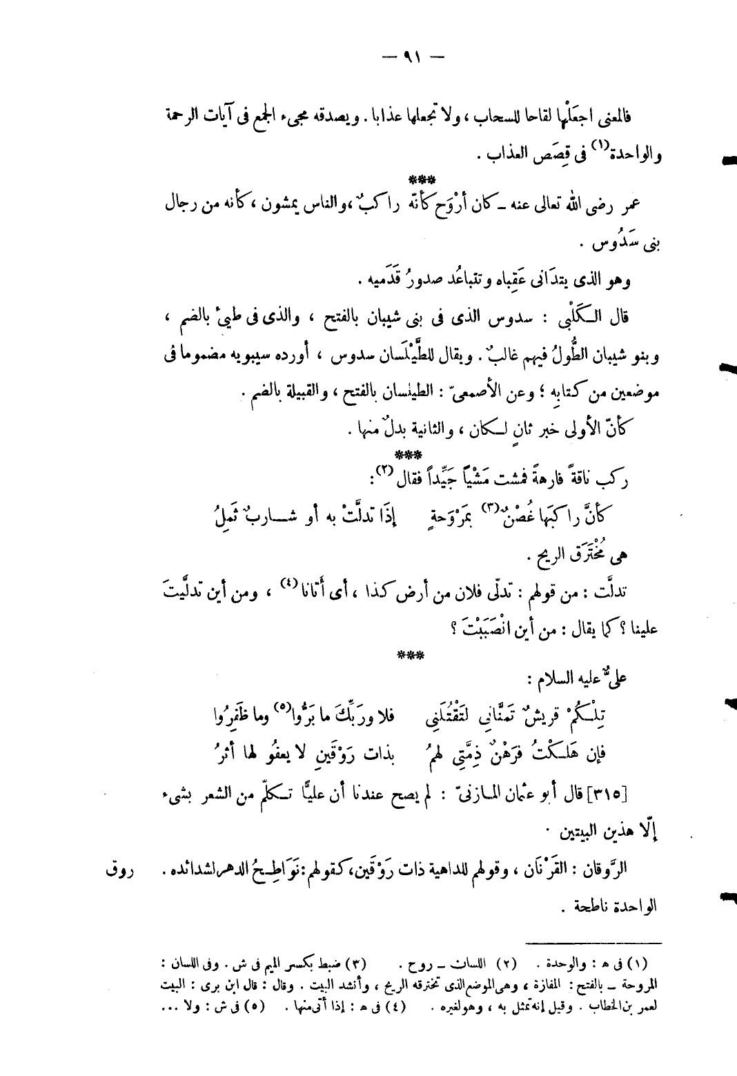 1 - فَالْمَعْنى اجْعَلْهَا لقاحا للسحاب وَلَا تجعلها عذَابا. ويصدقه مَجِيء الْجمع فِي آيَات الرَّحْمَة والواحدة فى قصَص الْعَذَاب. عمر رضى الله تَعَالَى عَنهُ كَانَ أروح كَأَنَّهُ رَاكب وَالنَّاس يَمْشُونَ كَأَنَّهُ من رجال بني سدوس. وَهُوَ الَّذِي يتدانى عقباه وتتباعد صُدُور قَدَمَيْهِ. قَالَ الْكَلْبِيّ: سدوس الَّذِي فِي بني شَيبَان بِالْفَتْح وَالَّذِي فِي طَيء بِالضَّمِّ وَبَنُو شَيبَان الطول فيهم غَالب. وَيُقَال للطيلسان سدوس أوردهُ سِيبَوَيْهٍ مضموما فِي موضِعين من كِتَابه وَعَن الْأَصْمَعِي: الطيلسان بِالْفَتْح والقبيلة بِالضَّمِّ. كَأَن الأولى خبر ثَان لَكَانَ وَالثَّانيَِة بدل مِنْهَا. ركب نَاقَة فارهة فمشت جيدا فَقَالَ ... كأنَّ راكبَها غُصْنٌ بمَرْوَحةٍ ... إذَا تدلت بِهِ أَو شَارِب ثمل ... هة مخترق الرّيح تدلت: من قَوْلهم: تدلى فلَان من أَرض كَذَا أى أَتَانَا وَمن تدليت علينا كَمَا يُقَال: من أَيْن انصببت عَليّ عَلَيْهِ السَّلَام: ... تِلْكُمْ قريشٌ تَمَّنانِي لتَقْتُلَنِي ... فَلَا ورَبِّكَ مَا بَرُّوا وَمَا ظَفِرُوا