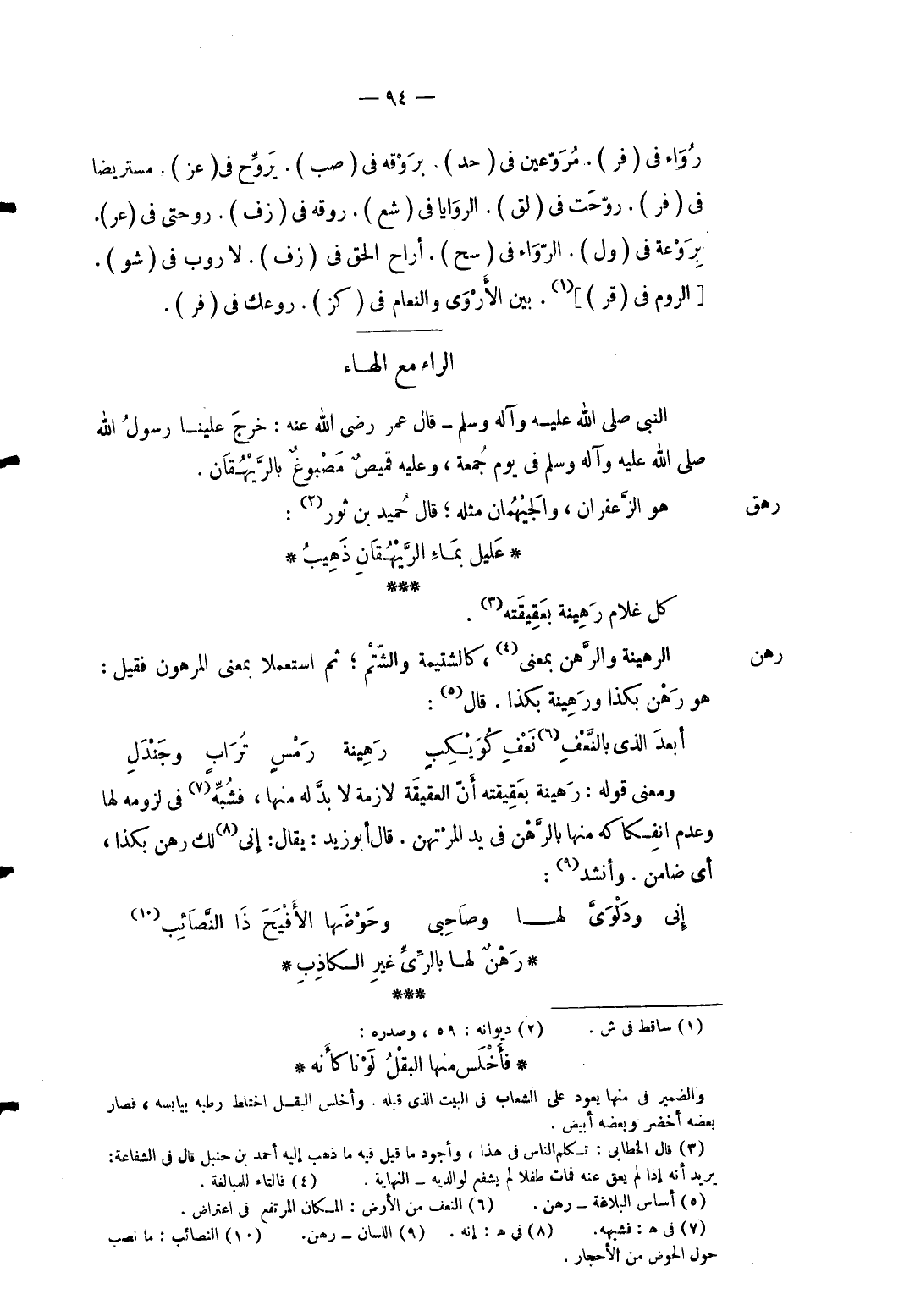 رهن الرهينة وَالرَّهْن بِمَعْنى كالشتيمة والشتم ثمَّ استعملا بِمَعْنى الْمَرْهُون فَقيل: هُوَ رهن بِكَذَا ورهينة بِكَذَا. قَالَ: ... أبعدَ الَّذِي بالنَّعْفِ نَعْفِ كُوَيْكِبٍ ... رَهِينة رَمْسٍ تُرَابٍ وجَنْدَلِ ... وَمعنى قَوْله: رهينة بعقيقته أَن الْعَقِيقَة لَازِمَة لَا بُد لَهُ مِنْهَا فَشبه (7) فِي لُزُومه لَهَا وَعدم انفكاكه مِنْهَا بِالرَّهْنِ فِي يَد الْمُرْتَهن. قَالَ أَبُو زيد: إِنِّي لَك رهن بِكَذَا أَي ضَامِن. وَأنْشد: ... إِنِّي ودَلْوَيَّ لَهَا وصَاحِبي ... وحَوْضَها الأَفْيَحَ ذَا النَّصَائِب