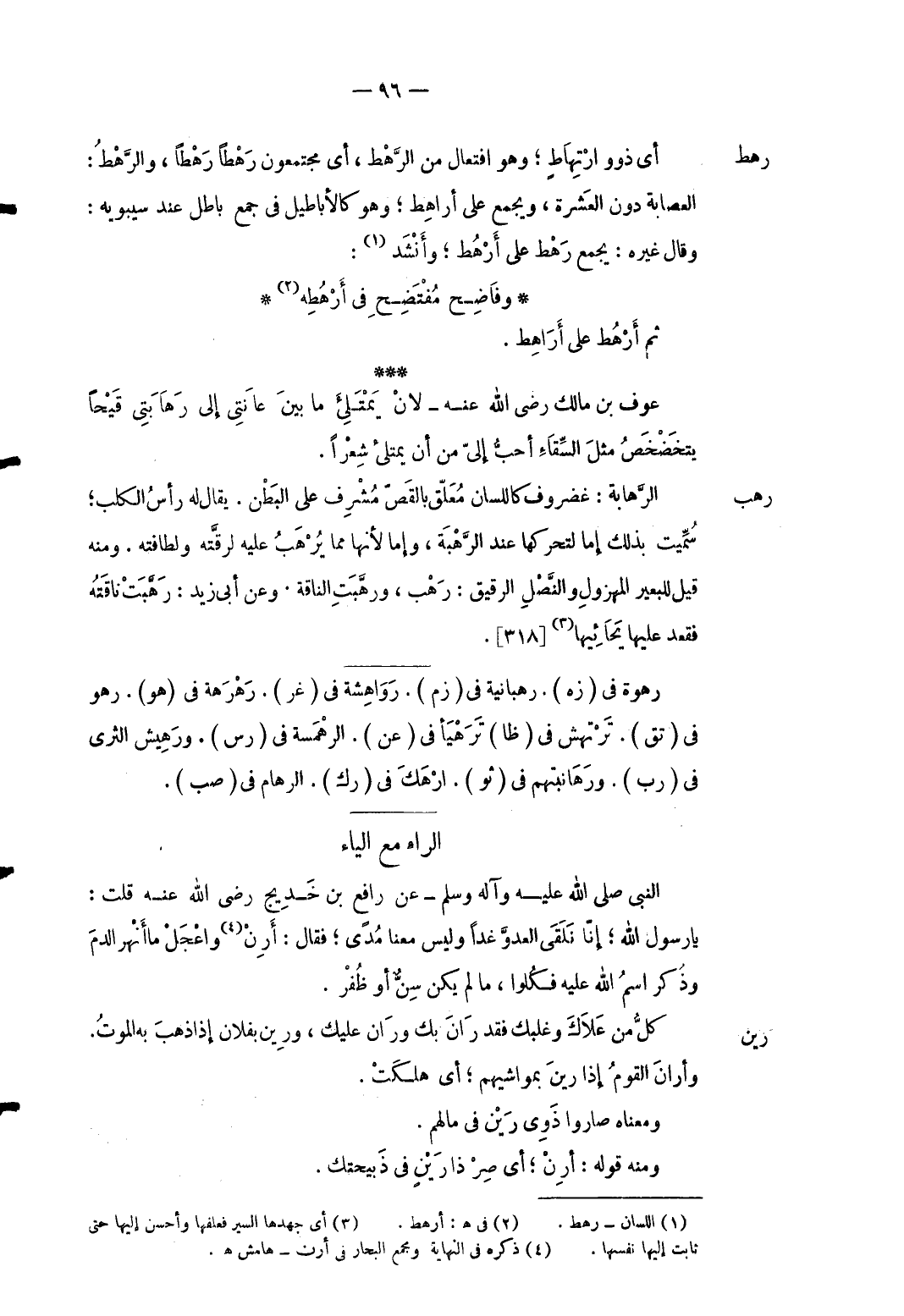 6 - رَهْط أَي ذَوُو ارتهاط وَهُوَ افتعال من الرَّهْط أَي مجتمعون رهطاً رهطاً والرهط: الْعِصَابَة دون الْعشْرَة وَيجمع على أراهط وَهُوَ كالأباطيل فِي جمع بَاطِل عِنْد سِيبَوَيْهٍ: وَقَالَ غَيره: يجمع رَهْط على أرهط: وَأنْشد: ... وفَاضِح مُفْتَضِحِ فِي أَرْهُطِه ... ثمَّ أرهط على أراهط. عَوْف بن مَالك رضى الله عَنهُ لَان يمتلىء مَا بَين عانتي إِلَى رهابتي قَيْحا يتخضخض مثل السقاء أحب إِلَى من أَن يمتلىء شعرًا.