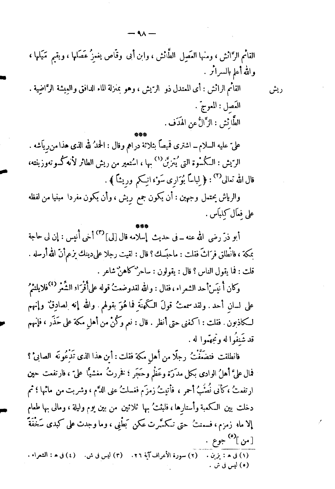 ريش الْقَائِم الرائش: أَي المعتدل ذُو الريش وَهُوَ بِمَنْزِلَة المَاء الدافق والعيشة الراضية. العصل: المعوج. الطائش: الزالُّ عَن الهدف عَليّ عَلَيْهِ السَّلَام اشْترى قَمِيصًا بِثَلَاثَة دَرَاهِم وَقَالَ: الْحَمد لله الَّذِي هَذَا من رياشه. الريش: الْكسْوَة الَّتِي يتزين بهَا استعير من ريش الطَّائِر لِأَنَّهُ كسوته وزينته قَالَ تَعَالَى: {لباسا يواري سوآتكم ورِيشاً} . والرياش يحْتَمل وَجْهَيْن: أَن يكون جمع ريش وَأَن يكون مُفردا مَبْنِيا من لَفظه على فعال كلباس. أَبُو ذَر رَضِي الله عَنهُ فِي حَدِيث إِسْلَامه قَالَ [لي] أخي أنيس: إِن لي حَاجَة بِمَكَّة فَانْطَلق فَرَاثَ فَقلت: مَا حَبسك قَالَ: لقِيت رجلا على دينك يزْعم أَن الله أرْسلهُ. قلت: فَمَا يَقُول النَّاس قَالَ: يَقُولُونَ: سَاحر كَاهِن شَاعِر. وَكَانَ أنيس أحد الشُّعَرَاء فَقَالَ: وَالله لقد وضعت قَوْله على أَقراء الشّعْر فَلَا يلتئم على لِسَان أحد. وَلَقَد سَمِعت قَول الكهنة فَمَا هُوَ بقَوْلهمْ. وَالله إِنَّه لصَادِق وَإِنَّهُم لَكَاذِبُونَ. فَقلت: اكْفِنِي حَتَّى انْظُر قَالَ: نعم وَكن من أهل مَكَّة على حذر فَإِنَّهُم قد شنفوا لَهُ وتجهموا لَهُ. فَانْطَلَقت فَتَضَعَّفْت رجلا من أهل مَكَّة فَقلت: أَيْن هَذَا الذى تَدعُونَهُ الصابىء فَمَال عليّ أهل الْوَادي بِكُل مَدَرَة وَعظم وَحجر فَخَرَرْت مغشياًّ عليّ فارتفعت حِين ارْتَفَعت كَأَنِّي نصب أَحْمَر فَأتيت زَمْزَم فغسلت عني الدَّم وشربت من مَائِهَا ثمَّ دخلت بَين الْكَعْبَة وَأَسْتَارهَا فَلَبثت بهَا ثَلَاثِينَ من بَين يَوْم وَلَيْلَة وَمَالِي بهَا طَعَام إِلَّا مَاء زَمْزَم فَسَمنت حَتَّى تَكَسَّرَتْ عُكَن بَطْني وَمَا وجدت على كَبِدِي سخْفَة [من] جوع.