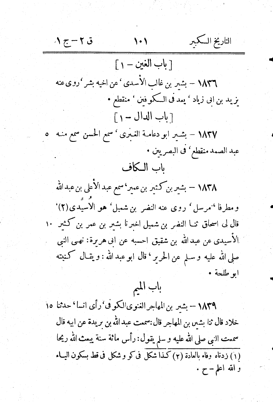1842 - بَشِيرٌ مَوْلَى مُعَاوِيَةَ سَمِعَ عَشَرَةً مِنْ أَصْحَابِ النَّبِيِّ صَلَّى اللَّهُ عَلَيْهِ وَسَلَّمَ أَحدُهُمْ (2) فَرْوَةُ (3) في رؤية الهلال -