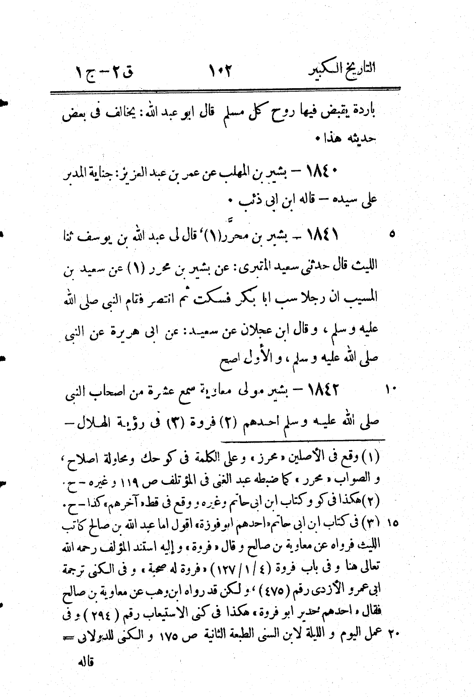 وقد روى عثمان بن ابى العاتكة نحو هذا الحديث عن شيخ فسئل من الشيخ فقال "..أبو فروة حدير السلمى " كذا وقع في كتاب ابن السنى لكن في ترجمة حدير من الاصابة ان ابن منده رواه من طريق عثمان بن ابى العاتكة وفيه " أبو فوزة " وجزم ابن عبد البر في الاستيعاب بأن هذا هو حدير السلمى الذى روى عنه العلاء بن الحارث، اقول وسيأتى في باب حدير " حدير السلمى ... العلاء بن الحارث سمع ابا فوزة حديرا مولى بنى سليم قوله..يونس بن ميسرة عن ابى فوزة حدير ... " وذكر ابن حبان في الثقات حديرا في التابعين بنحو ما ذكره البخاري ولكن وقع في النسخة " أبو نوزة " وذكر الدولابى (1 / 81) بابا آخر " من كنيته أبو فاطمة..وأبو فروة ... وأبو فروة حدير السلمى " ثم ذكر بالسند الذى ذكره المؤلف في ترجمة حدير إلى يونس بن ميسرة " عن ابى فروة حدير السلمى ... " كذا ولم يذكر في هذا الباب احدا يكنى بنحو هذه الكنية وإنما ذكر المكنين ابا فروة في باب آخر كما مر وذلك يدل انه وقع في النسخة تحريف وقد نقل ابن ماكولا عن كتاب الدولابى فذكر انه فيها " أبو فورة " قال " هو هكذا في هذه المواضع بتقديم الواو على الراء " وقال الحافظ في التبصير " فروة جماعة وبتقديم الواو أبو فورة حدير السلمى كذا ضبطه ابن ماكولا والذى اعرفه انه بالزاى كذا رأيته في تاريخ البخاري وغيره " والذى يترجح انه " حدير السلمى أبو فوزة " والله اعلم - ح.