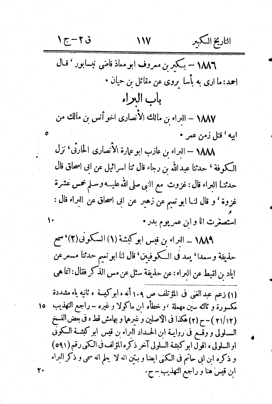 1891 - البراء بْن ناجية الكاهلي، قَالَ لِي ابْن أَبِي شيبة عَنْ قبيصة: هو المحاربي وَقَالَ ابْن عيينة: الكاهلي عَنِ ابْن مَسْعُود، ولم يذكر سماعا من ابْن مَسْعُود (2) .