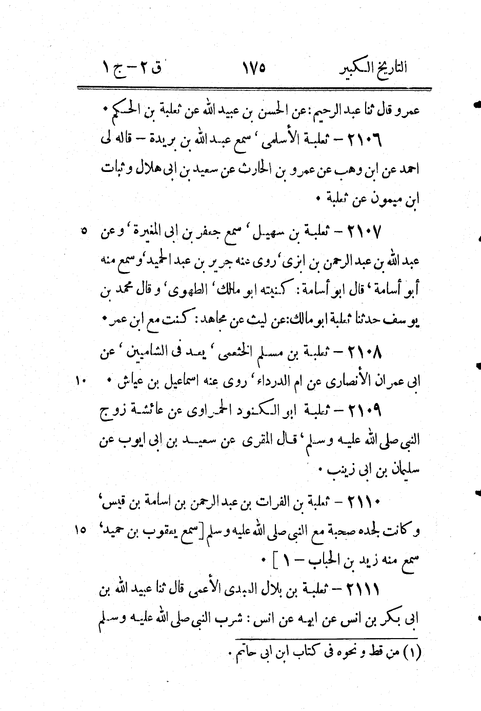 2114 - ثمامة بْن حزن القشيري، سَمِعَ عَائِشَةَ، سَمِعَ منه الأسود بْن شيبان الْبَصْرِيّ والجريري ورأى عَبْد اللَّه بْن عُمَر وأبا الدرداء وَقَالَ لِي علي بْن نصر قَالَ ثنا سهل بن حماد أبو عتاب