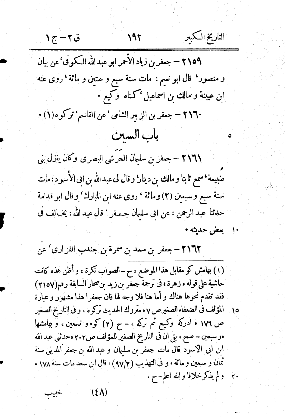 (1) ستأتي ترجمته في بابه وفيها رواية جعفر هذا عنه، ووقع في قط " حبيب " خطأ - ح (2) تقدمت ترجمته رقم (29) وفيها روايته عن جعفر هذا ووقع في قط " حبيب " خطأ - ح (3) من قط (4) ستأتي ترجمة ابنه عباس (4 / 1 / 3) " عَبَّاسُ بْنُ جَعْفَرِ بْنِ طَلْقِ بْنِ زَيْدٍ الشنى العبدى ... وراجع ترجمة جعفر ابن زيد بن صحار رقم (2157) - ح.