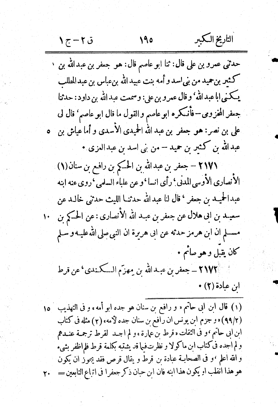 (1) قط " سنينات " كذا (2) كذا وقع في هذه الرواية وسيأتى كذلك في ترجمة خارجة واعتمد ابن حبان هذه الرواية فذكر خارجة في التابعين وجعفرا في اتباع التابعين ولفظه " جعفر بن عبد الرحمن يروى عن خارجة بن العوام عن ابى هريرة.." وخالفه ابن ابى حاتم فقال " جَعْفَرُ بْنُ عَبْدِ الرَّحْمَن بْنِ خَارِجَةَ بْنِ العوام يروى عن ابى هريرة.." ولم ار في كتابه ترجمة لخارجة والله اعلم - ح.